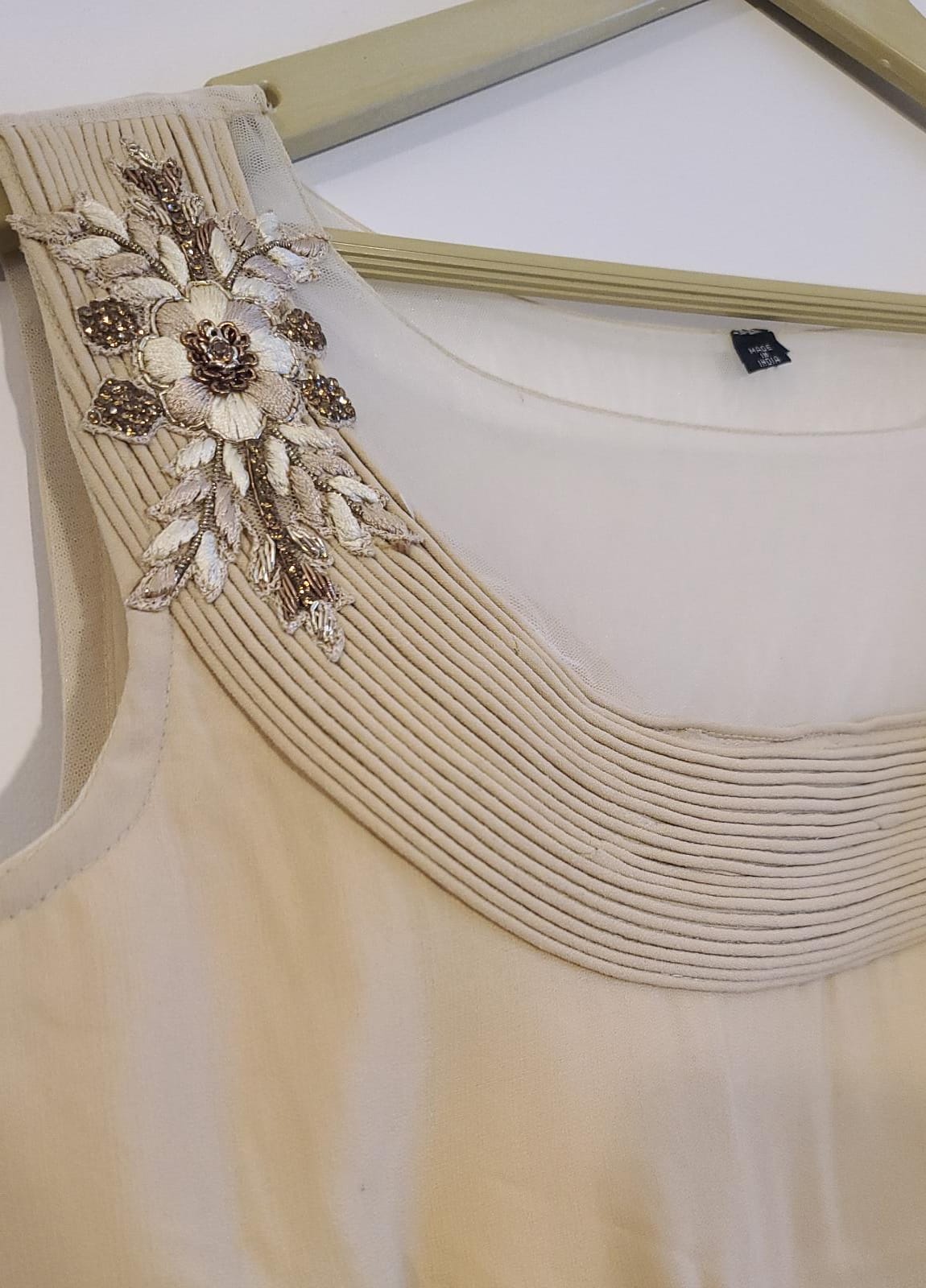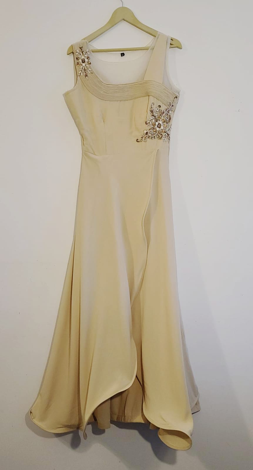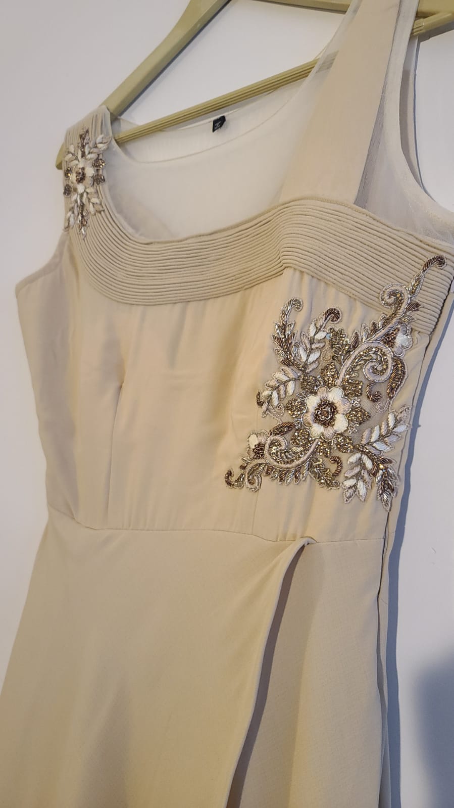 - Floor Length Gown Color beige Material -Fine Party-wear and Net on Upper Body Block