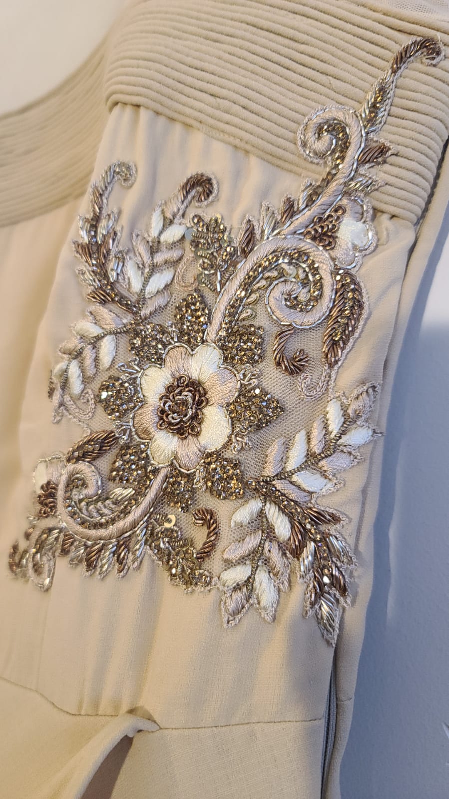 - Hand Embroidery Full flair Dress Pleated Pattern on Upper Body Sleeveless Shoulder Embroidery Heavy Flare Gown
