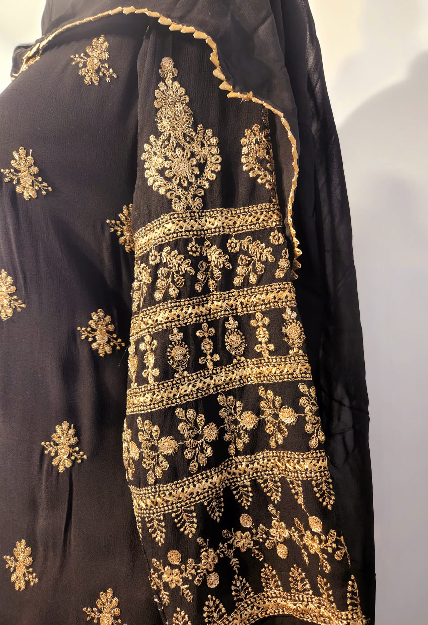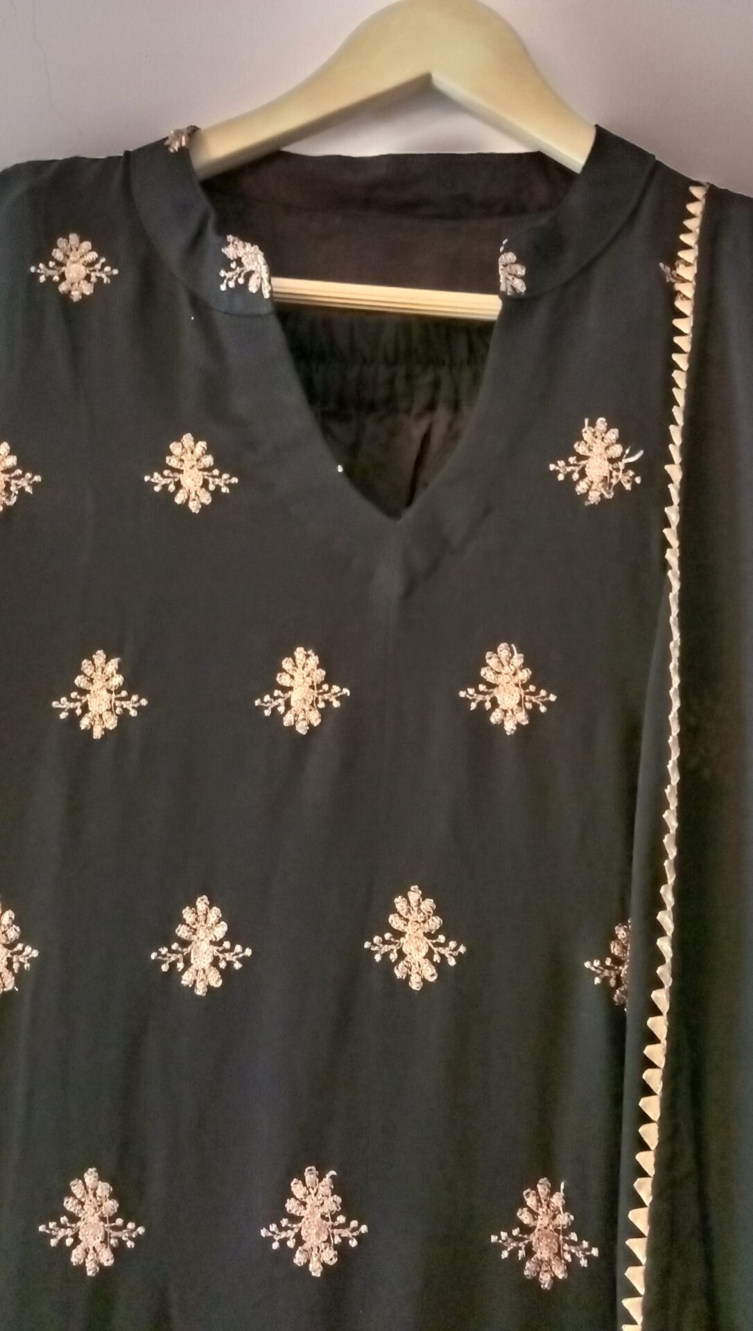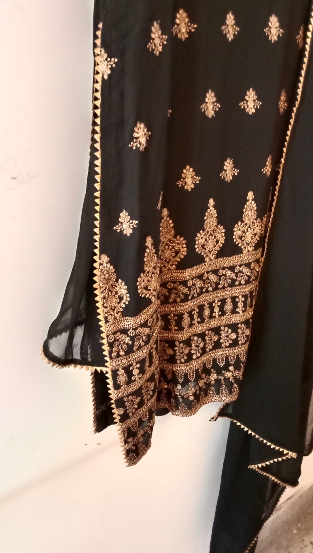 - Dry Clean Only Color: Black Shirt Fully Embroidered Slit Lace Dupatta Four Side Lace All Around Palazzo Lace