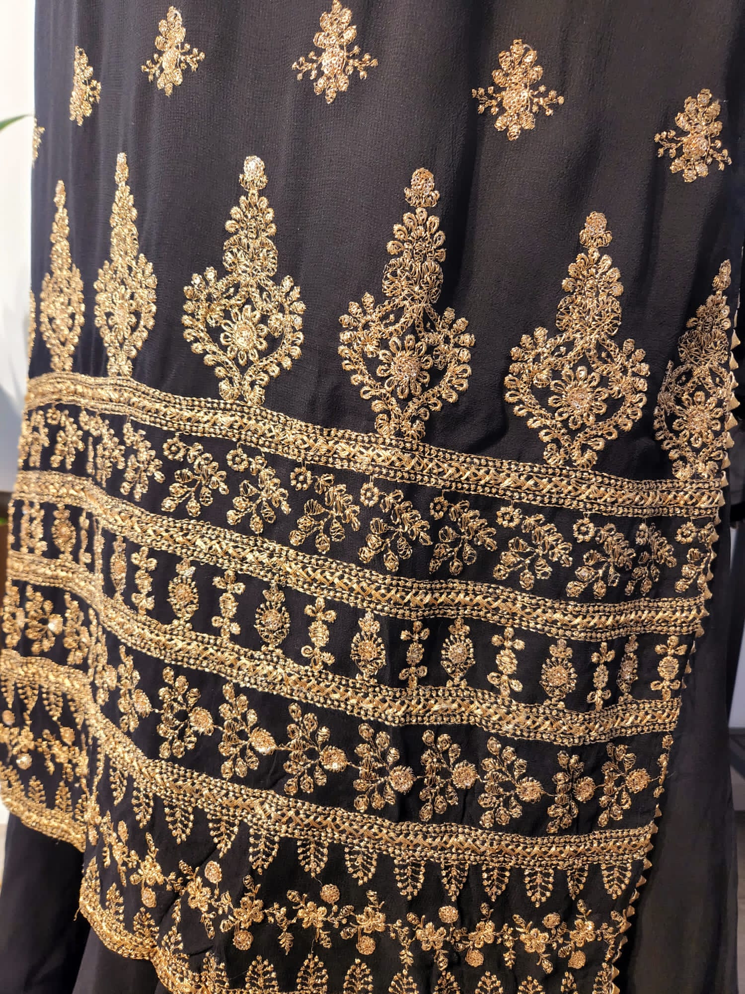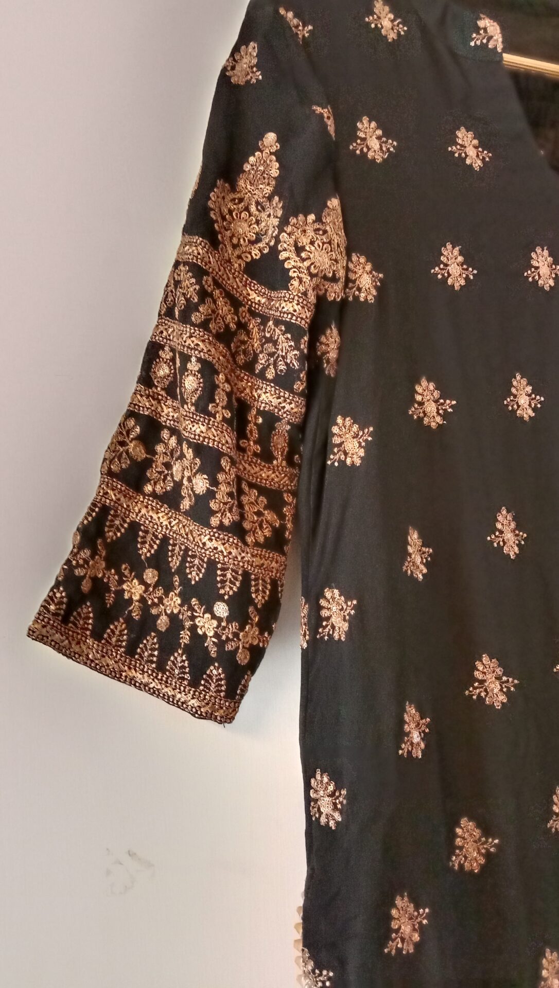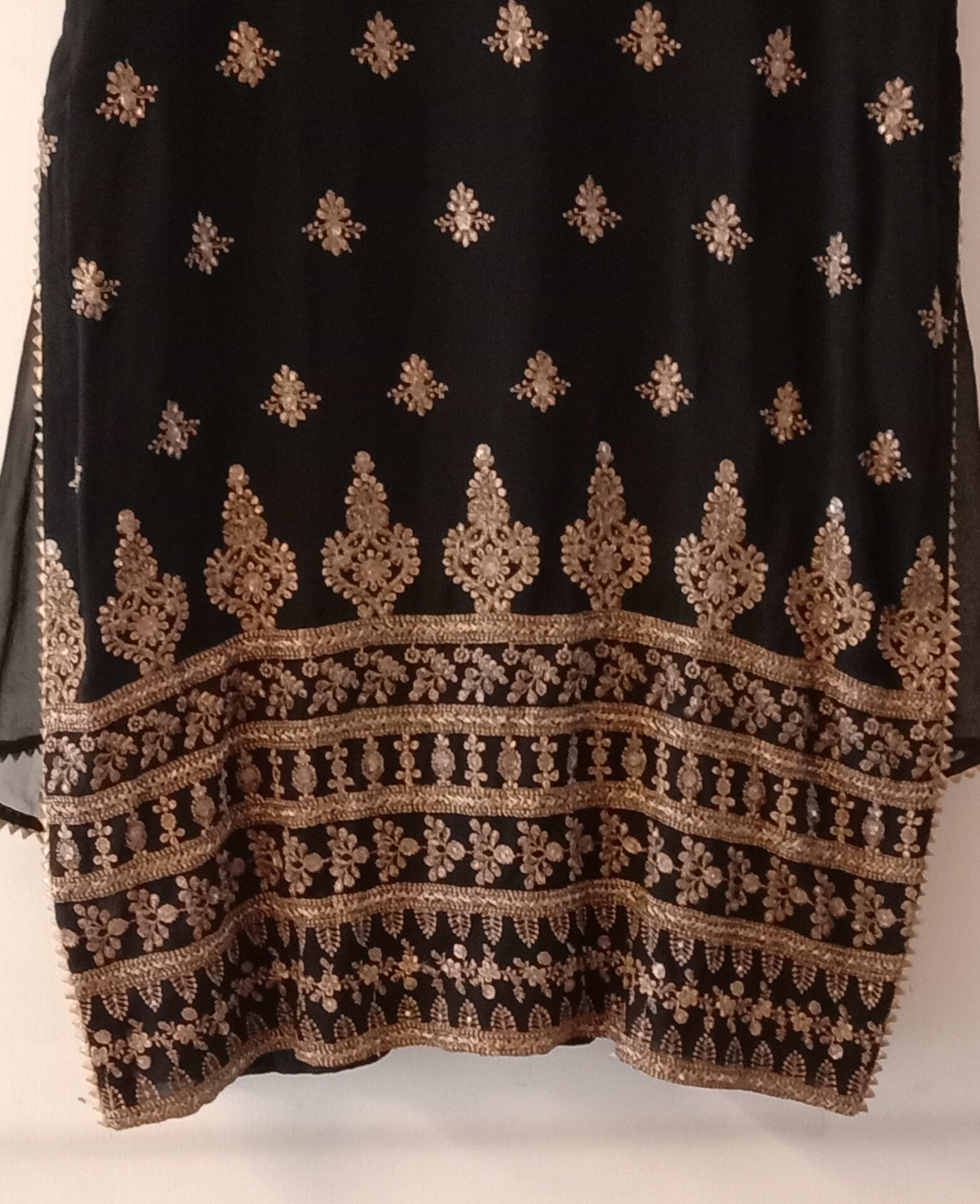 - Dry Clean Only Color: Black Shirt Fully Embroidered Slit Lace Dupatta Four Side Lace All Around Palazzo Lace