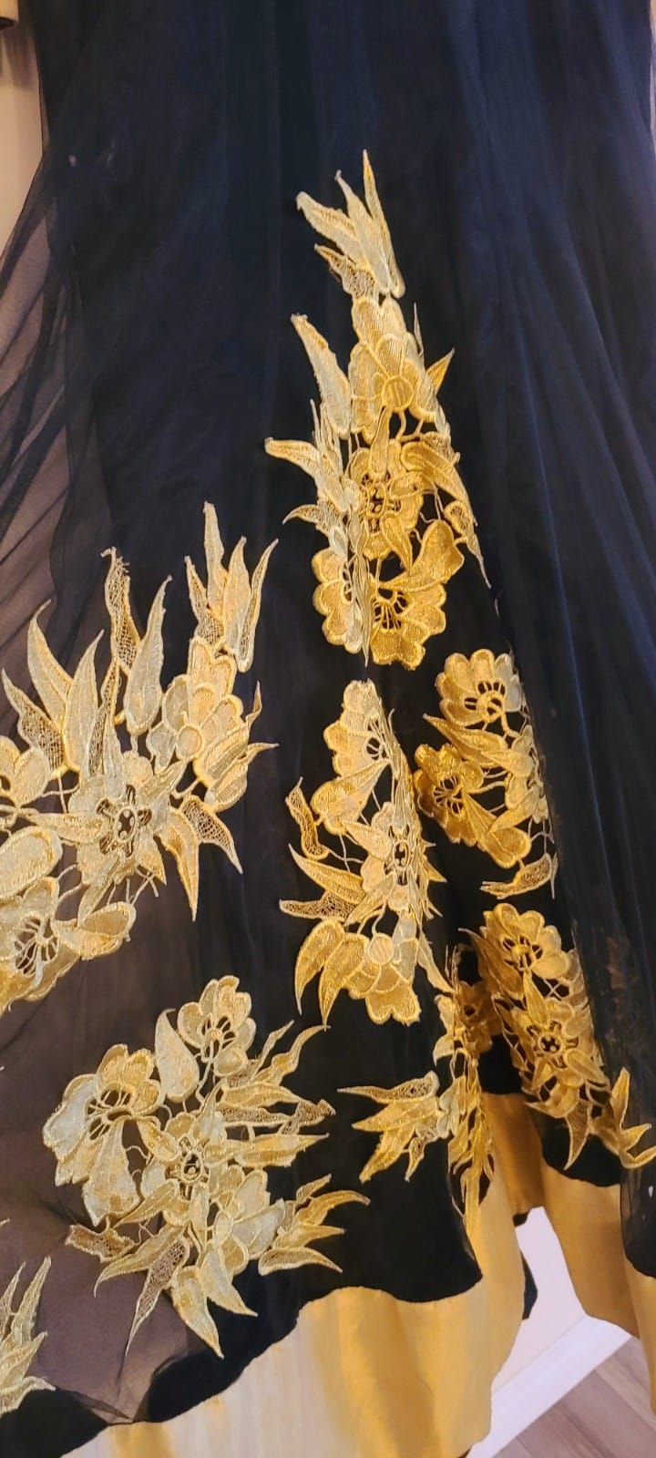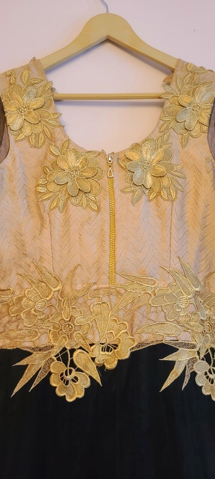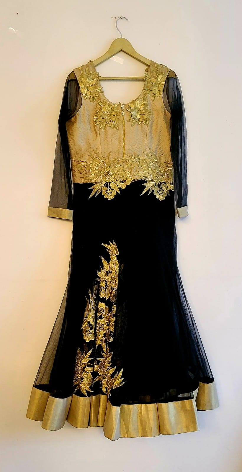 - Floor length Gown Colour Black & Golden Fabric- Net Full Sleeve Front Zip