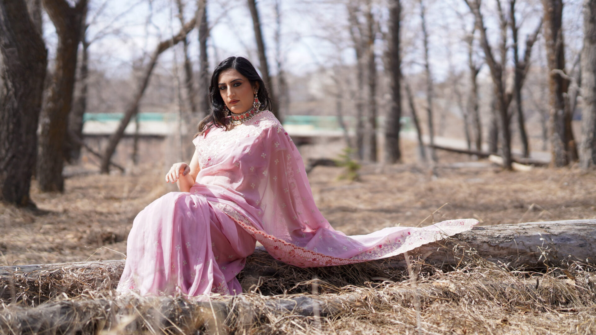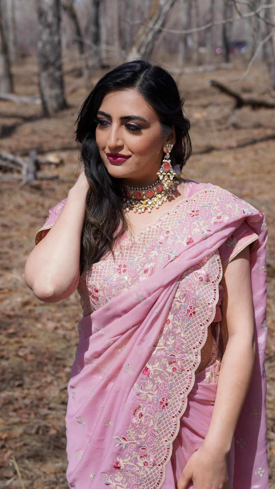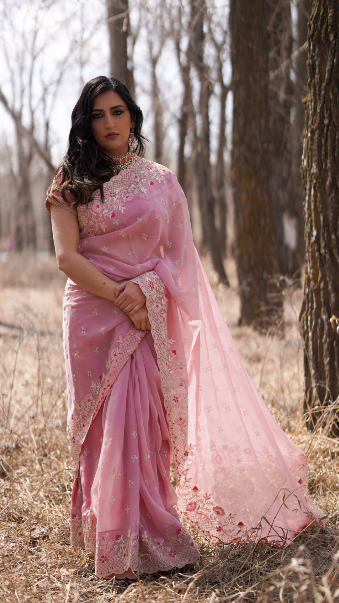 6-yard organza sari in blush pink with embroidered borders and pallu. Fully finished and ready to wear, perfect for semi-formal and formal occasions! More colour options are available.