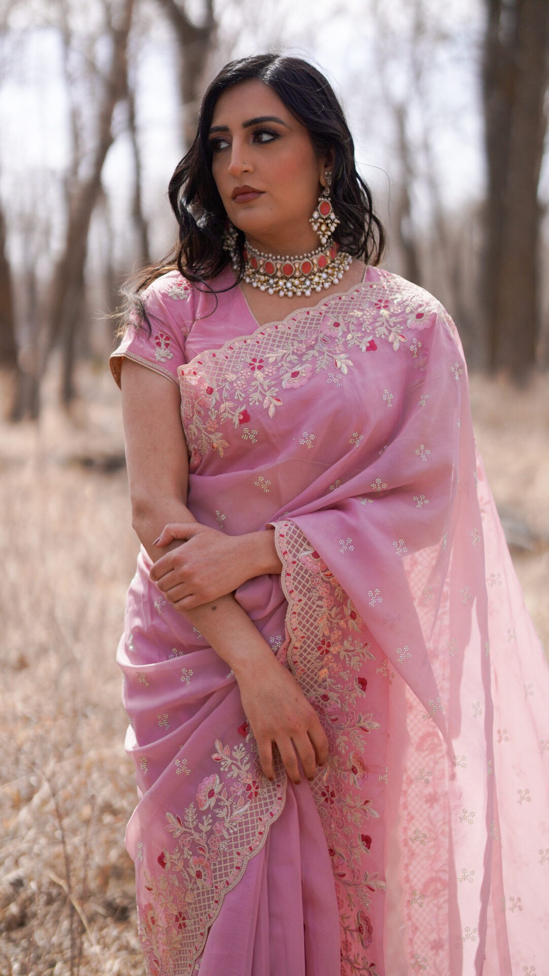 Blush Pink Organza Saree with Embroidered Floral Borders – Drape Style