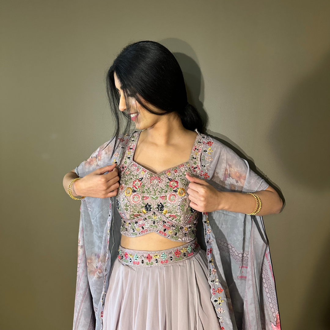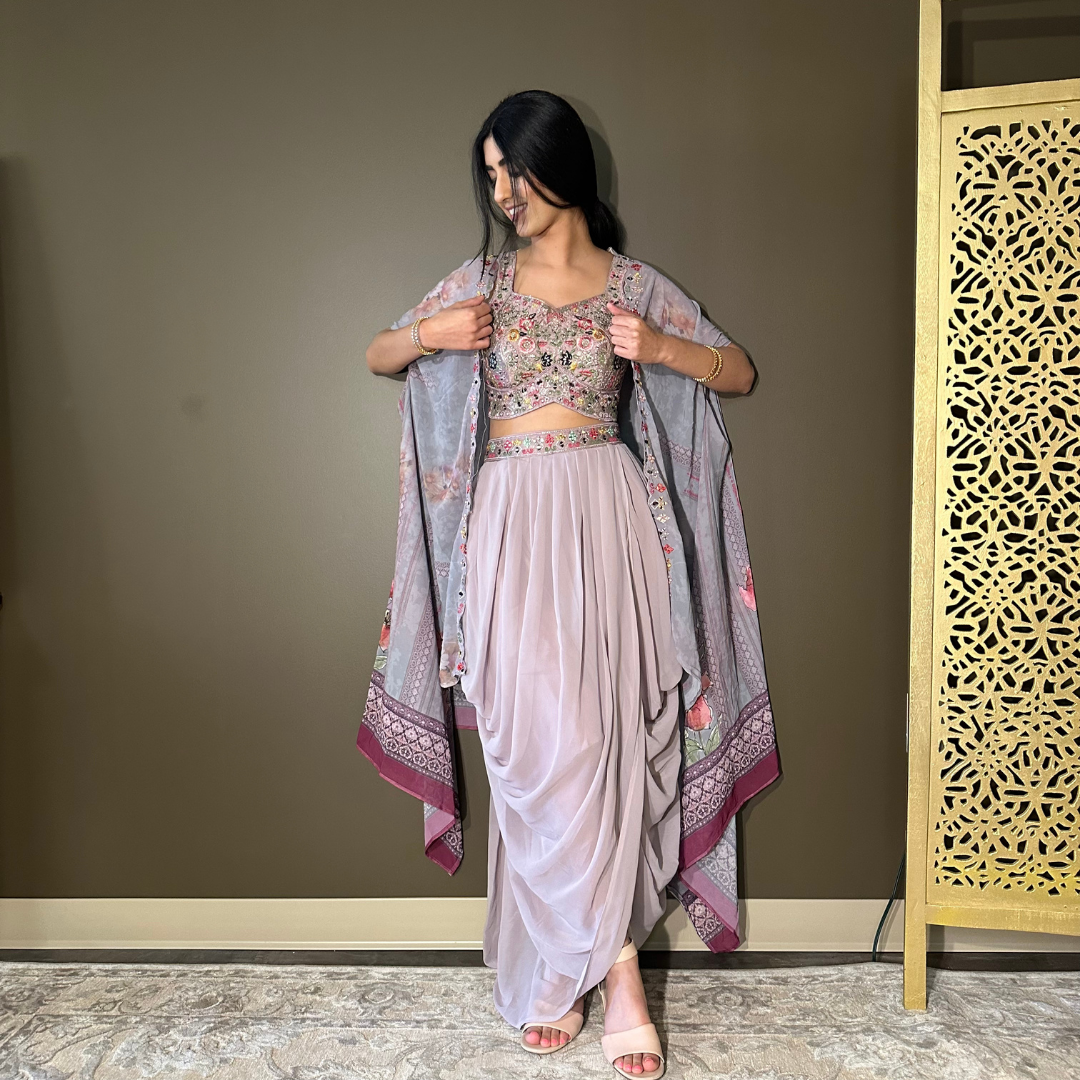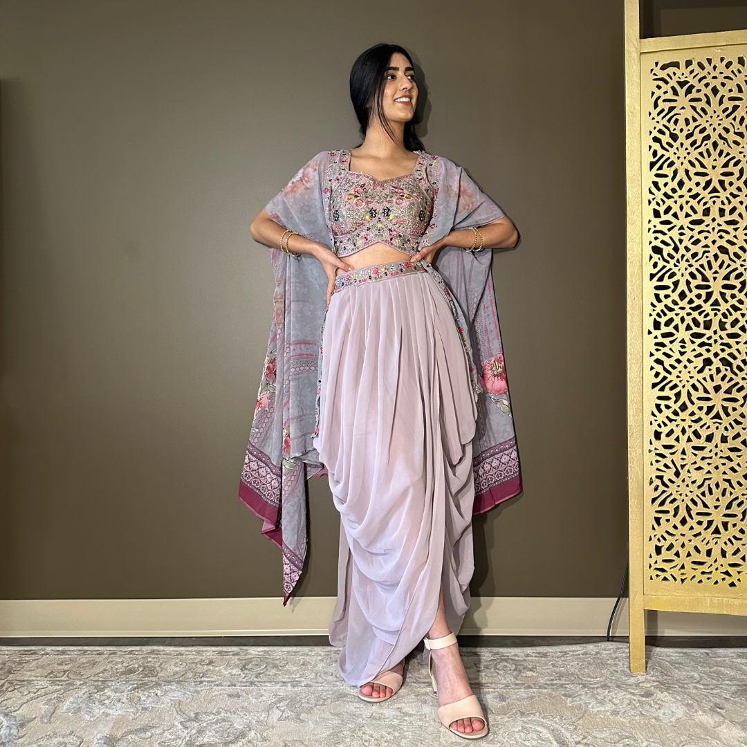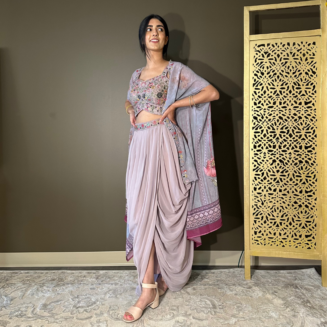 Cape Indo-western Fusion Dhoti-style Outfit – Lavender mirror handwork on blouse
