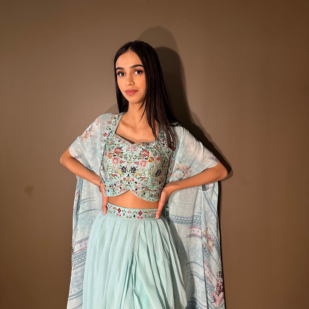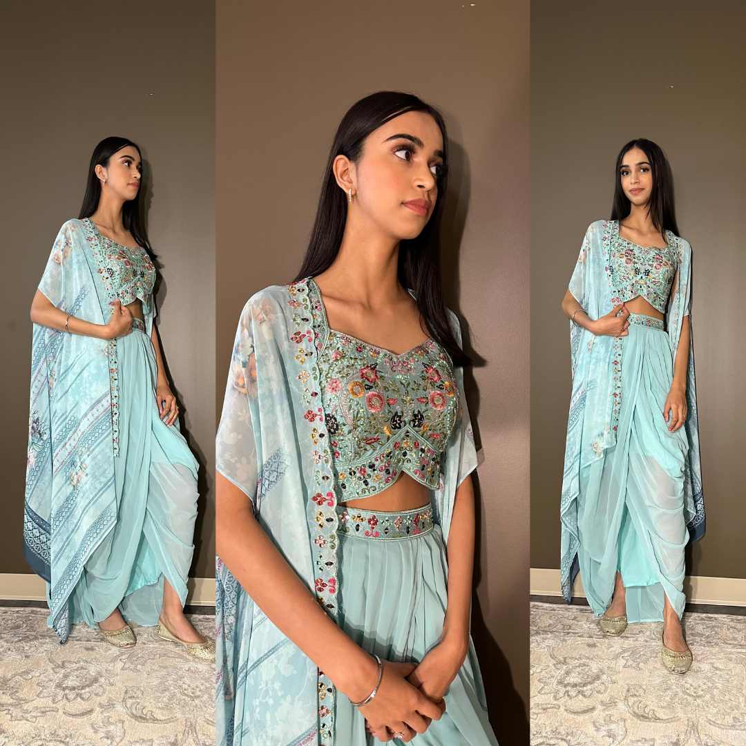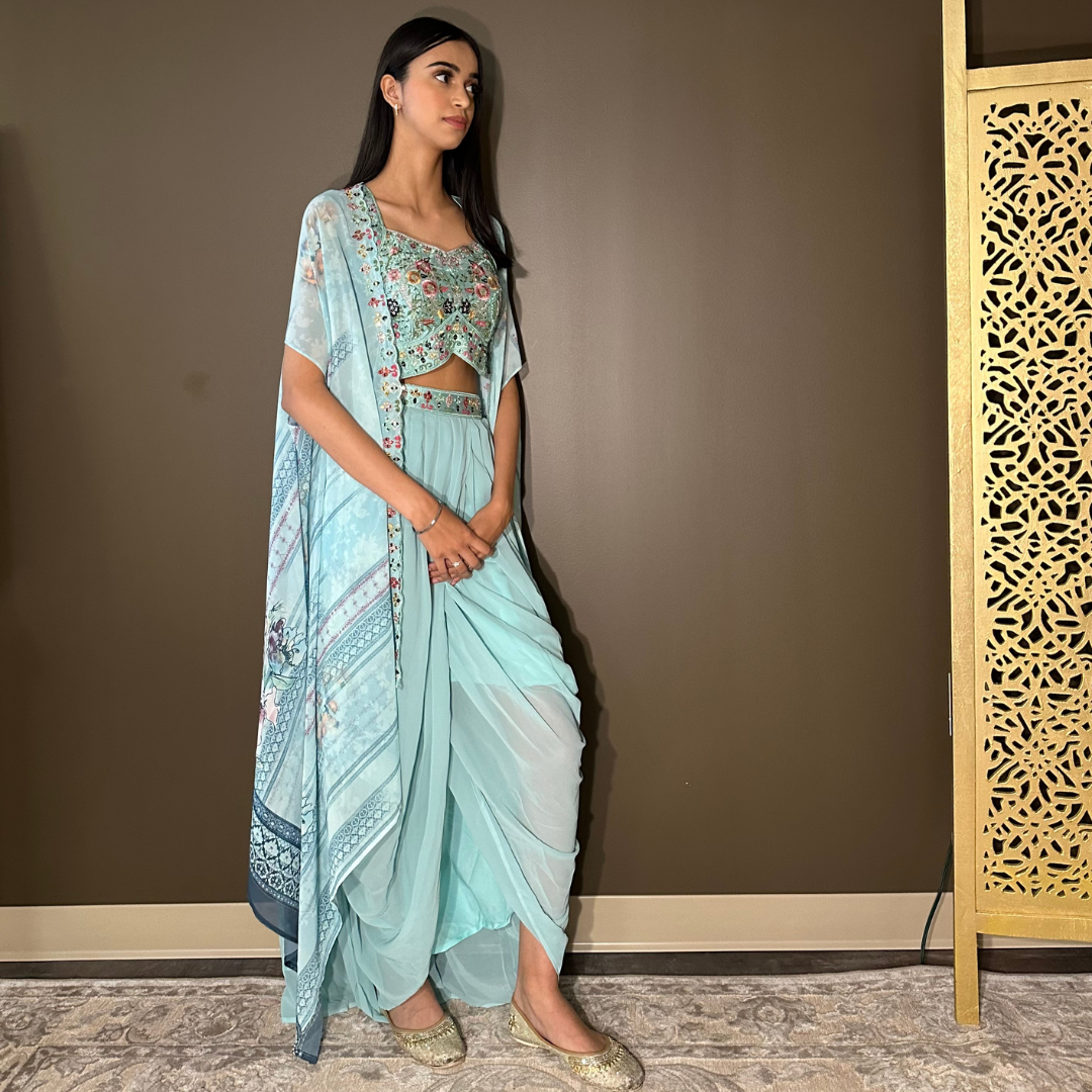 Cape Indo-western Fusion Dhoti-style Outfit – Sky Blue mirror handwork on blouse