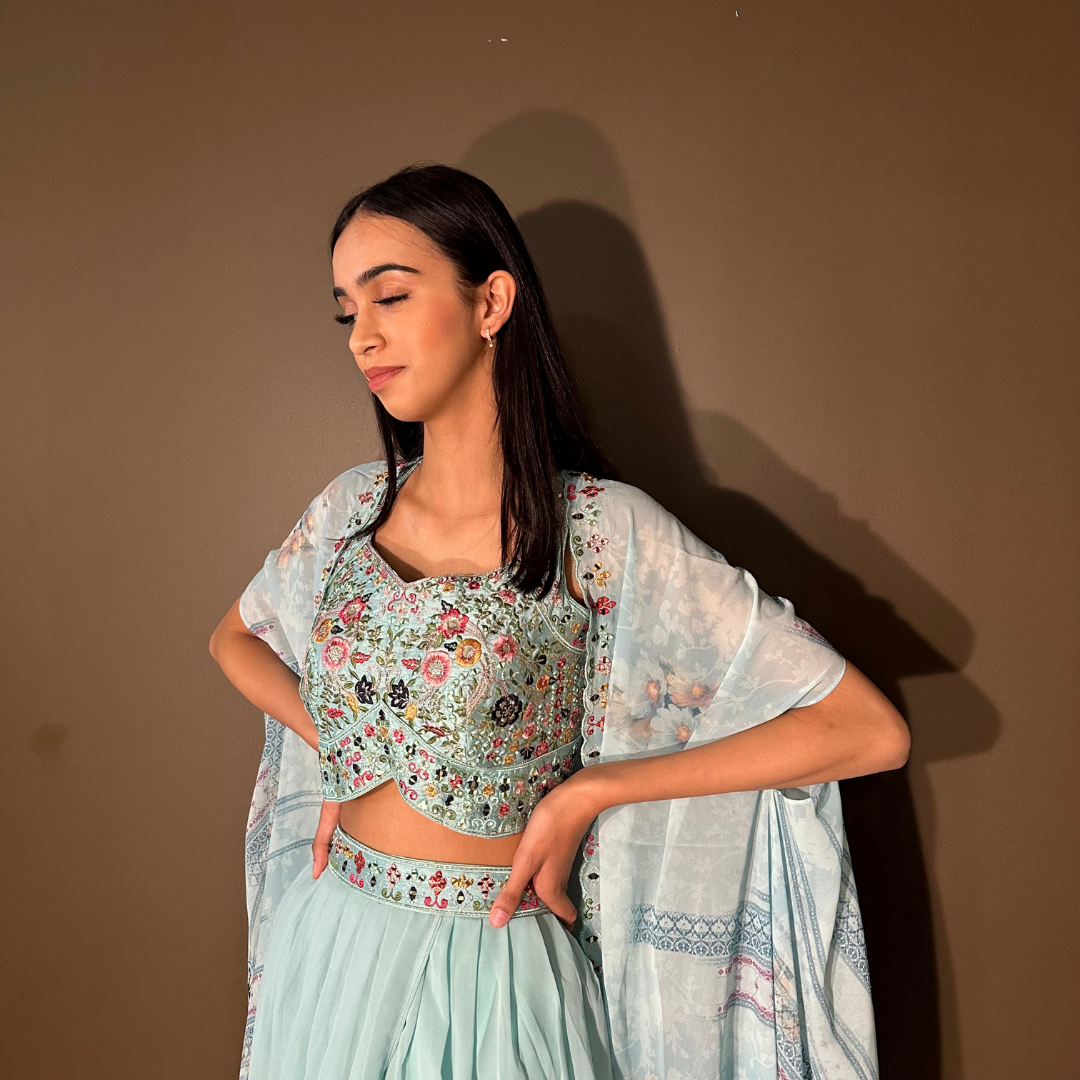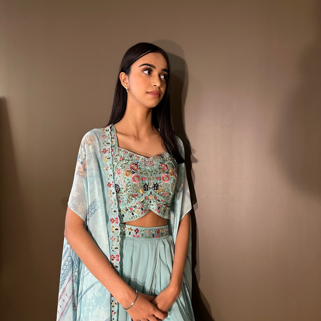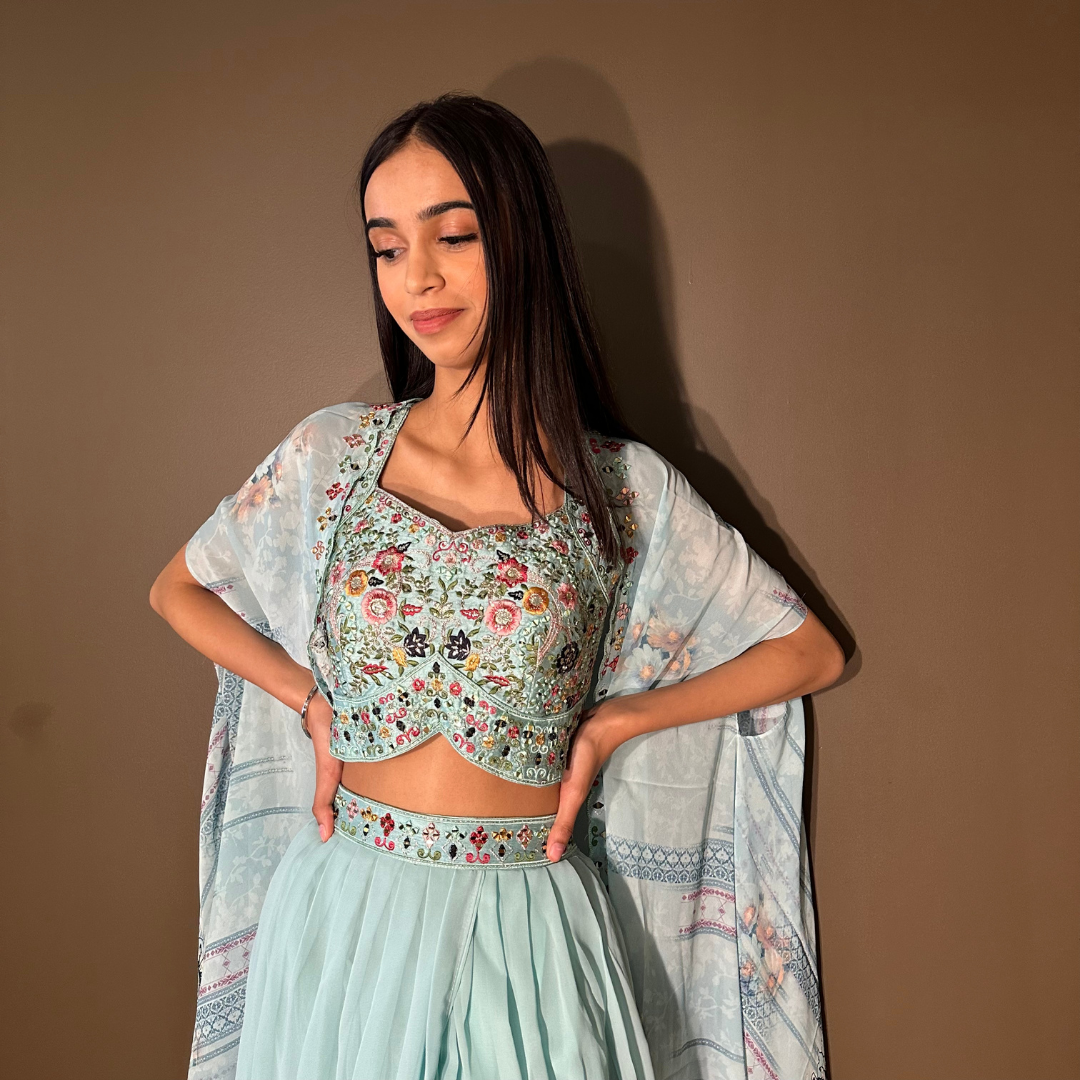 Cape Indo-western Fusion Dhoti-style Outfit – Sky Blue mirror handwork on blouse