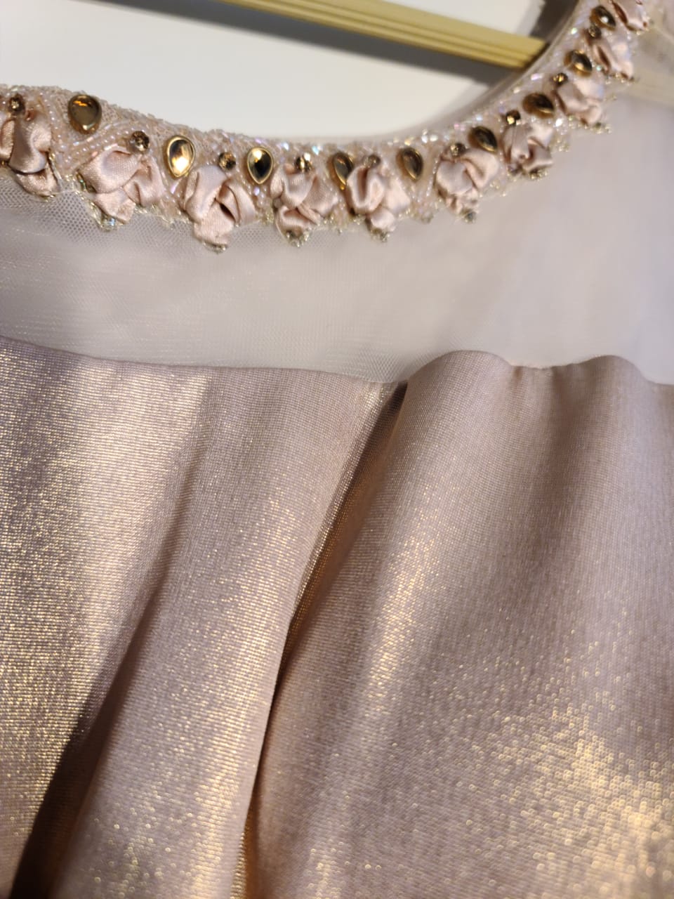 - Floor length Gown Colour Pink Material -Fine Partywear and net on upper body block Sleeveless Padded Cup Side Zip