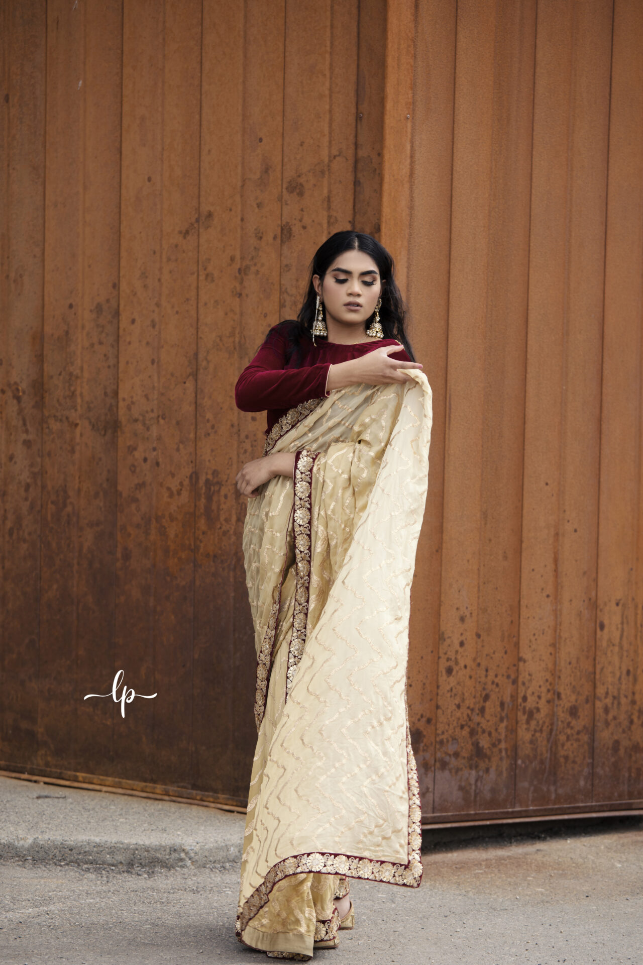 - Material-Velvet & Chiffon Color-Maroon Golden Full Sequence Embroidered Sari