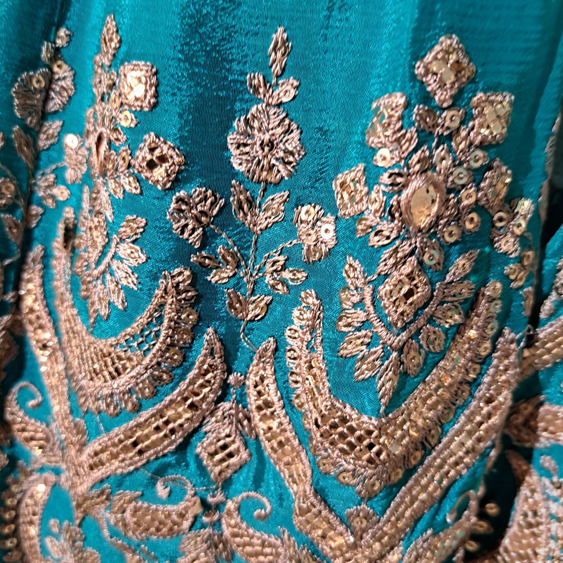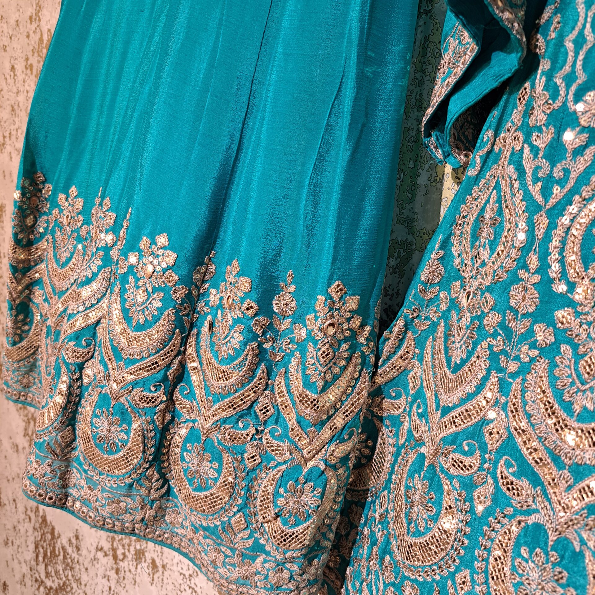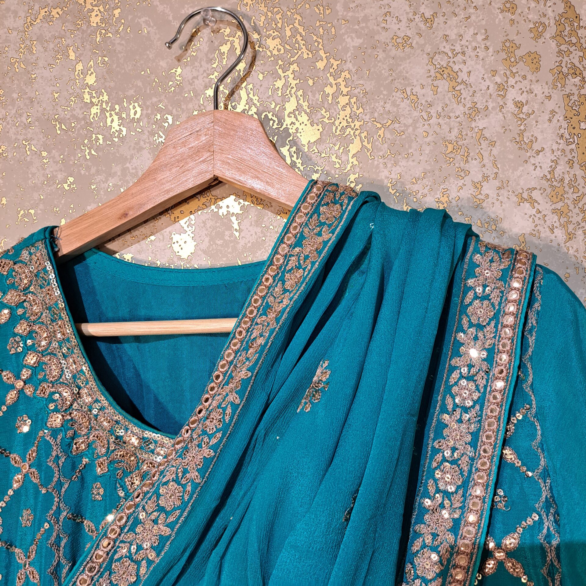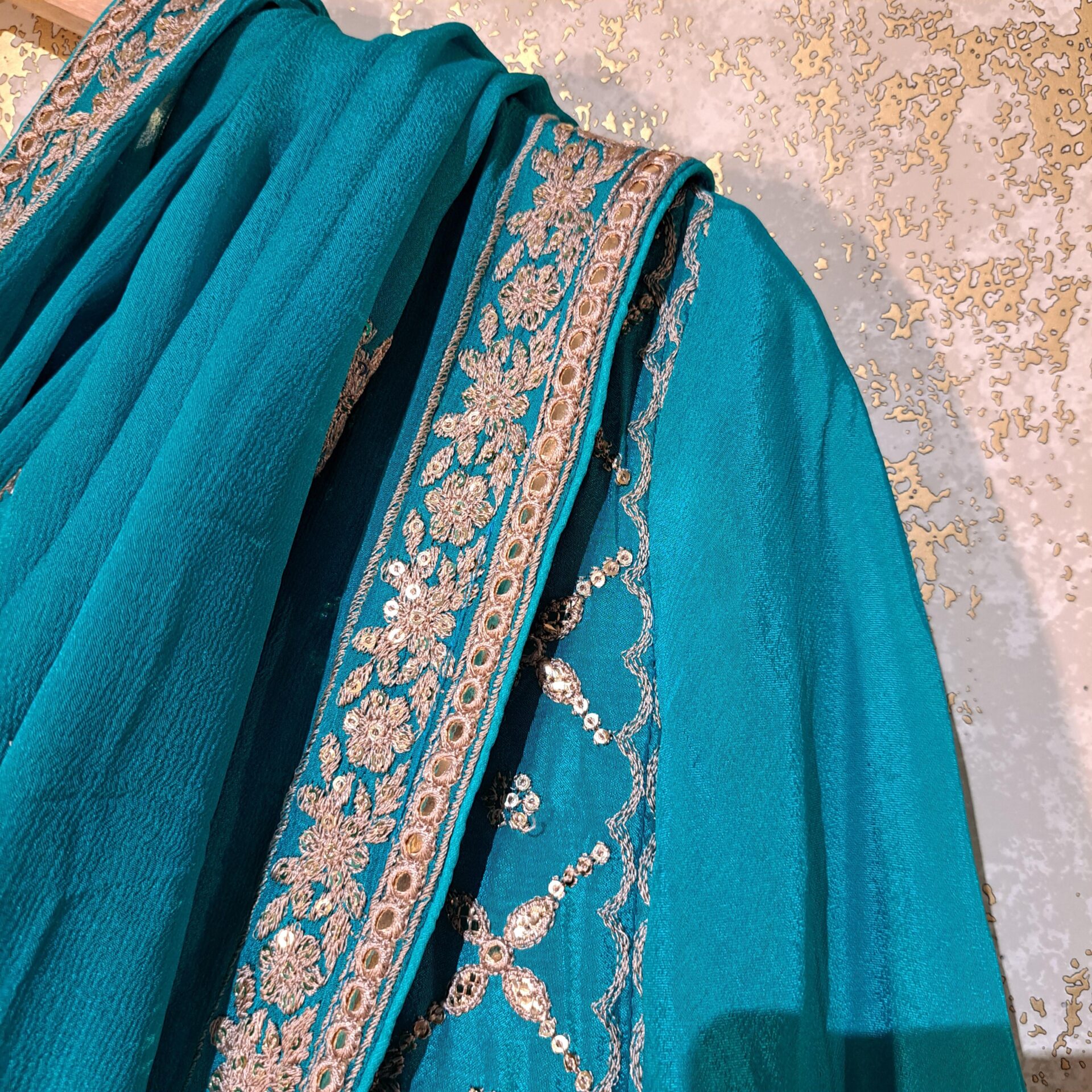 - Fabric:Silk Color Firozi Dupatta Four Side Embroidered Border