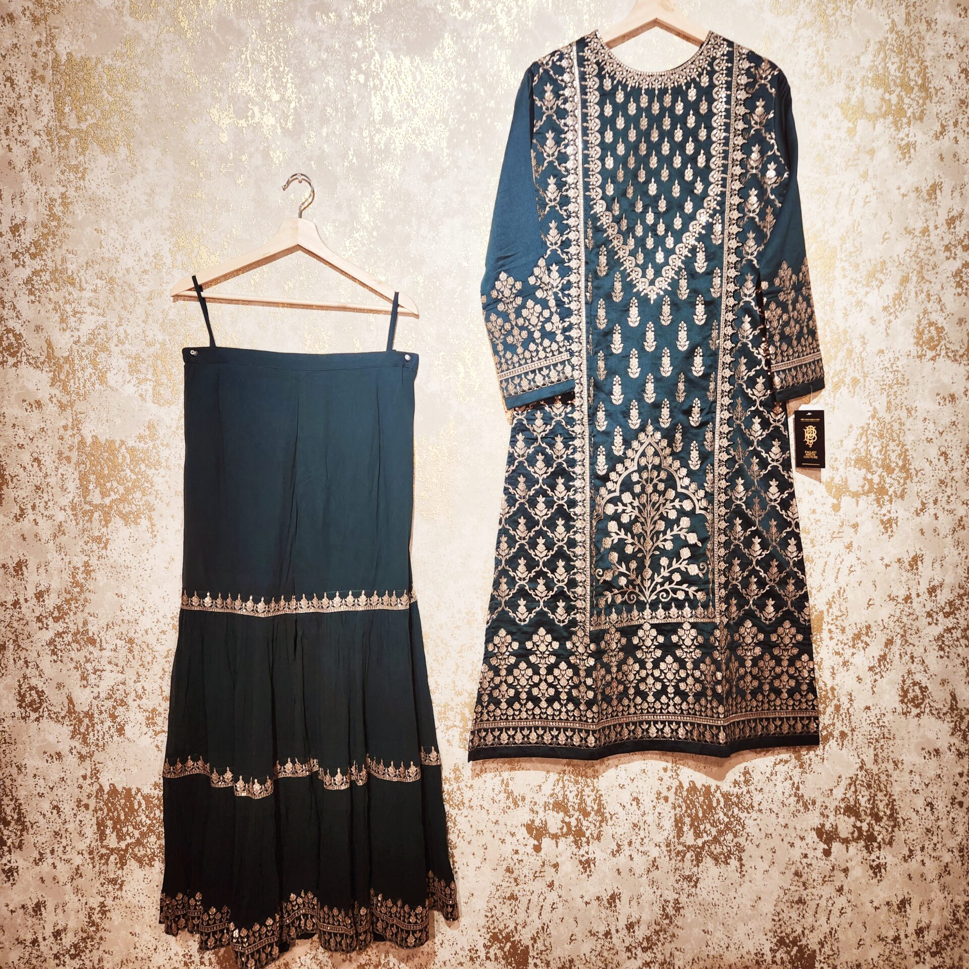 - Customized Designer Golden Sequence Thread Embroidery Suit,Shirt Palazzo Dupatta Set.