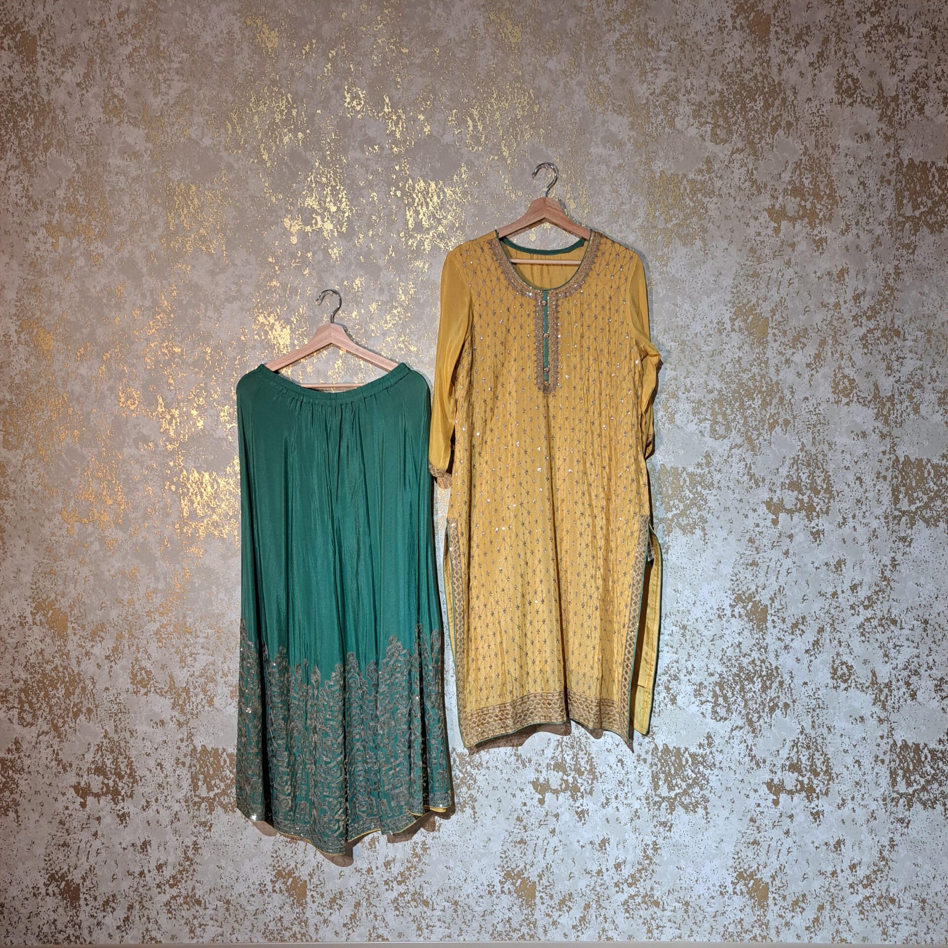 Bright Orange Raw Silk Wide-Leg Pants with Green Silk Blouse with Motifs