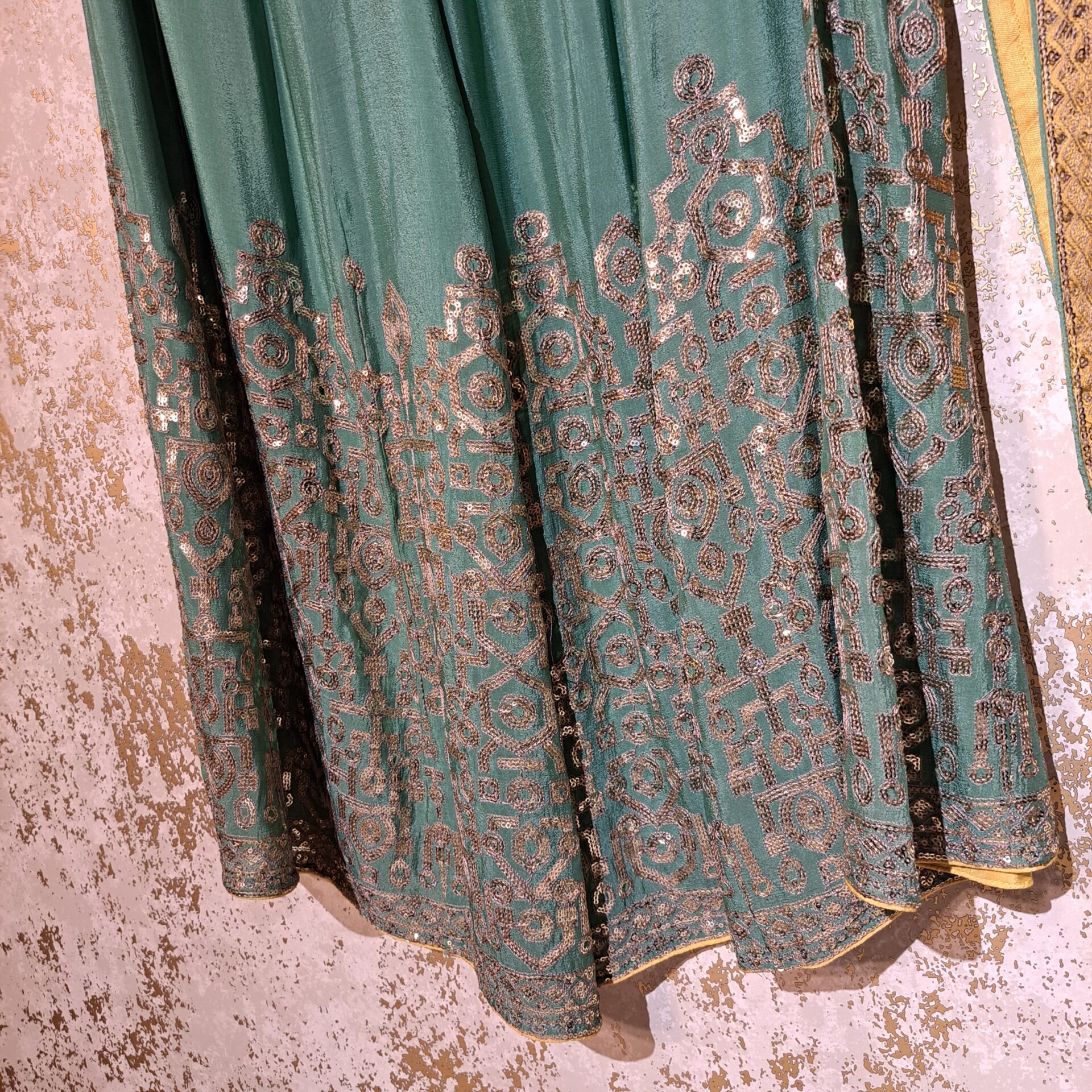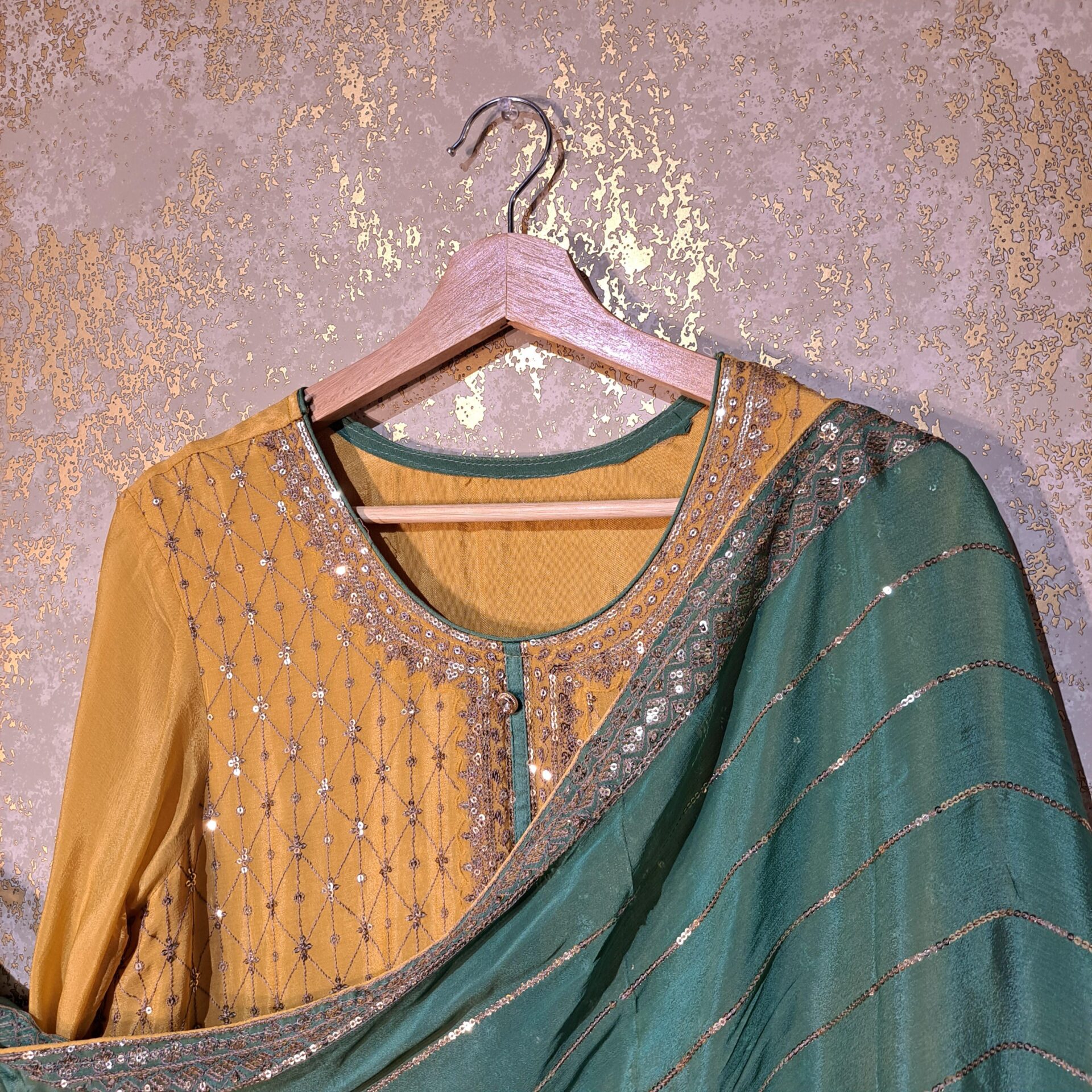 - Fabric: Silk Color Yellow See Green Dupatta Fabric: Chinon Chiffon with Sequence Work Fore Side Embroidered Lace