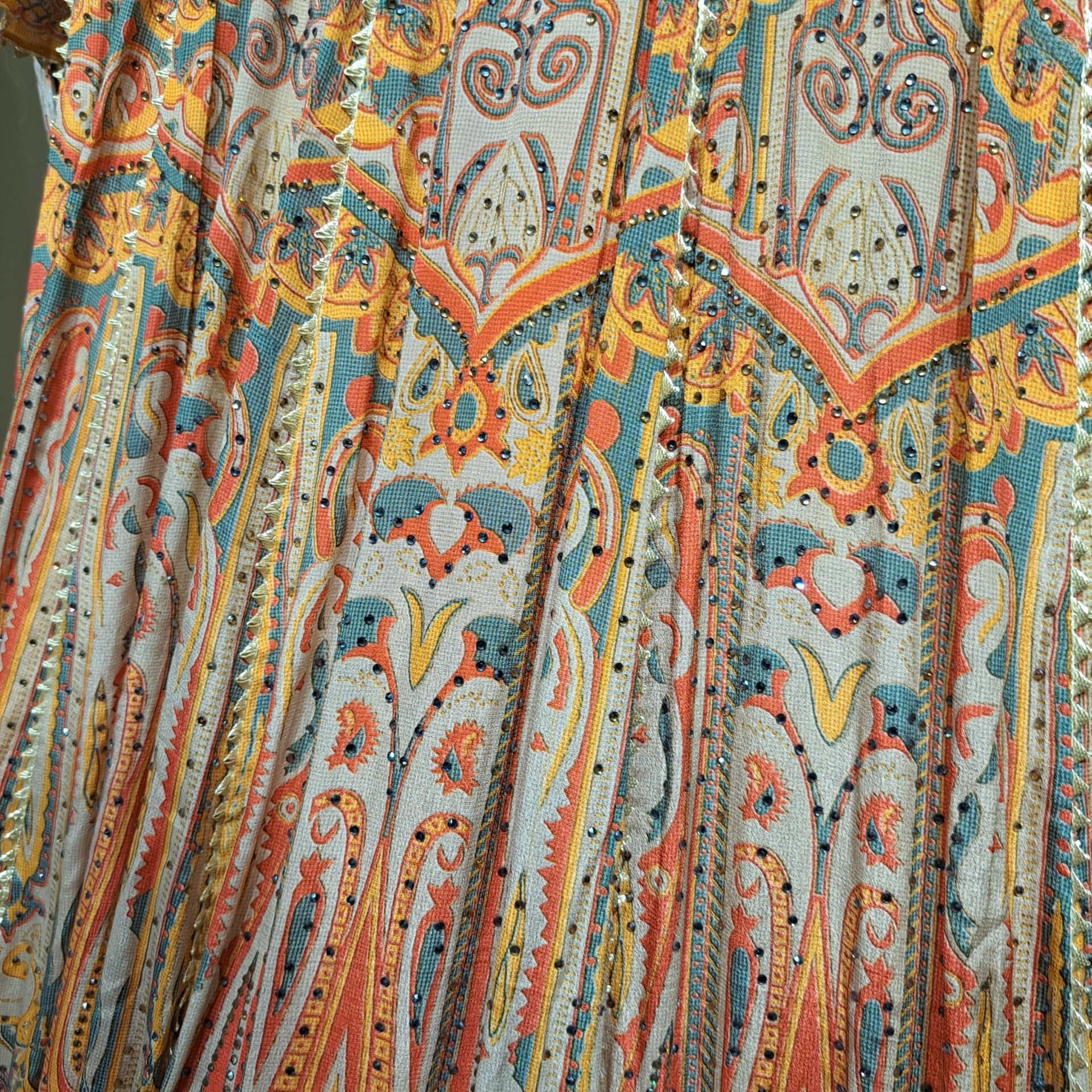 Bright Orange Raw Silk Wide-Leg Pants with Green Silk Blouse with Motifs