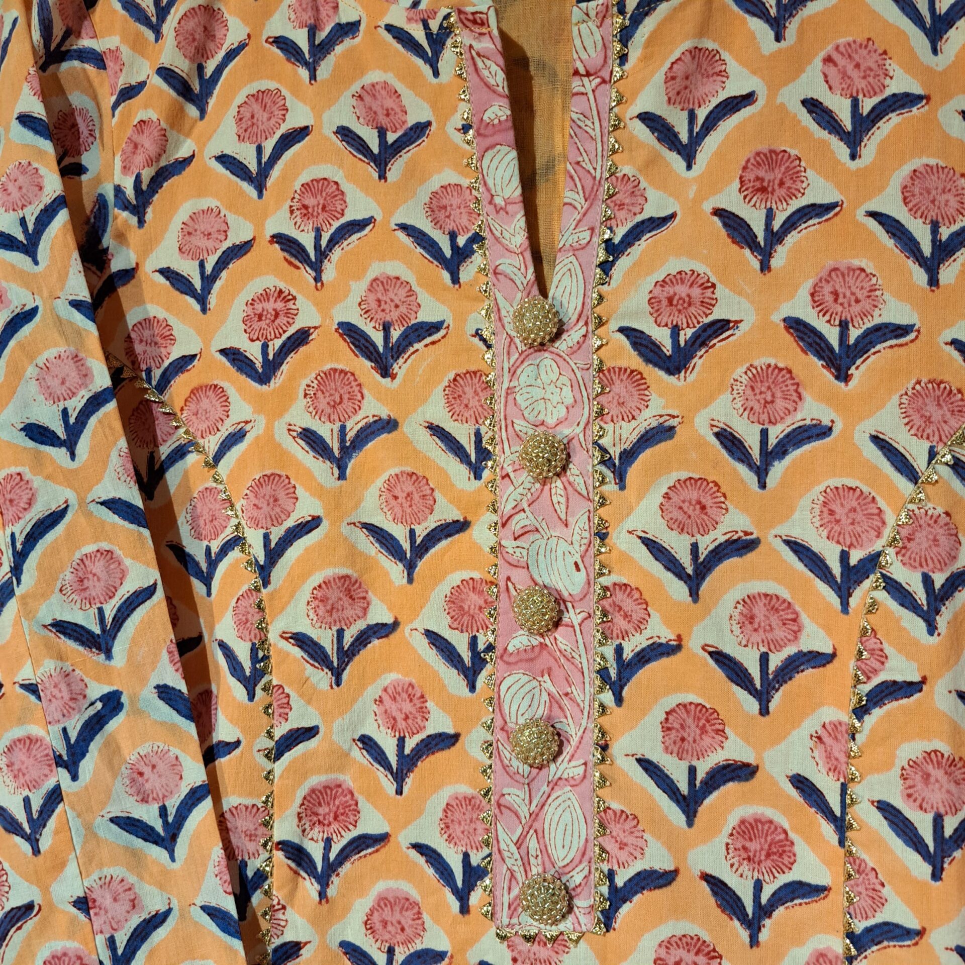 Fabric: Cotton Color Peach Pink Dupatta Fabric: Cotton Four Side Gota Lace Shirt Salwar Dupatta Block Printed Completely Stitched with Cotton Inner This Would Be Classy yet Fashionable Choice for Festive Season or Regular Wear. Fully Stitched. Customer can Altered this from Small to XL Size because it has margins Inside. Customized Orders Welcome. Dry Clean Only / Fully Stitched Salwar Suit With Dupatta