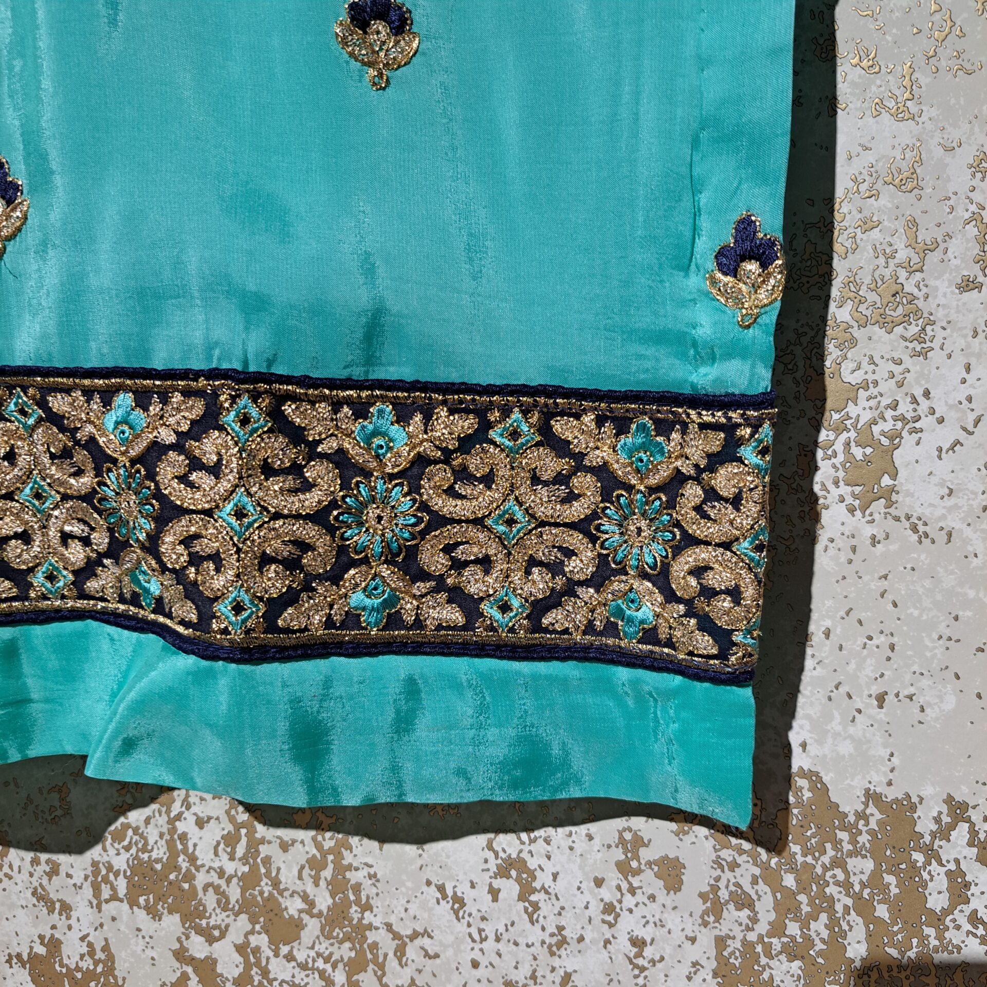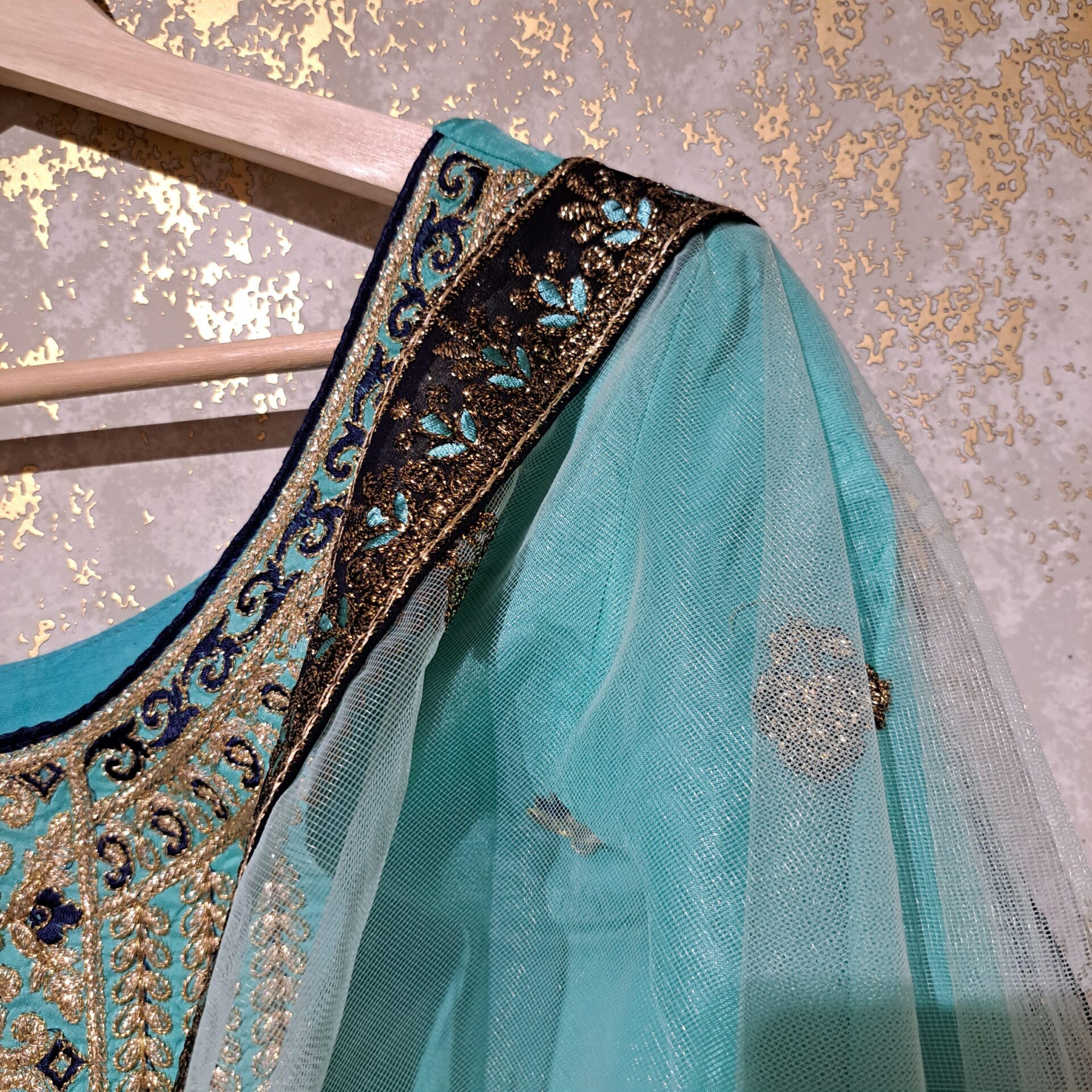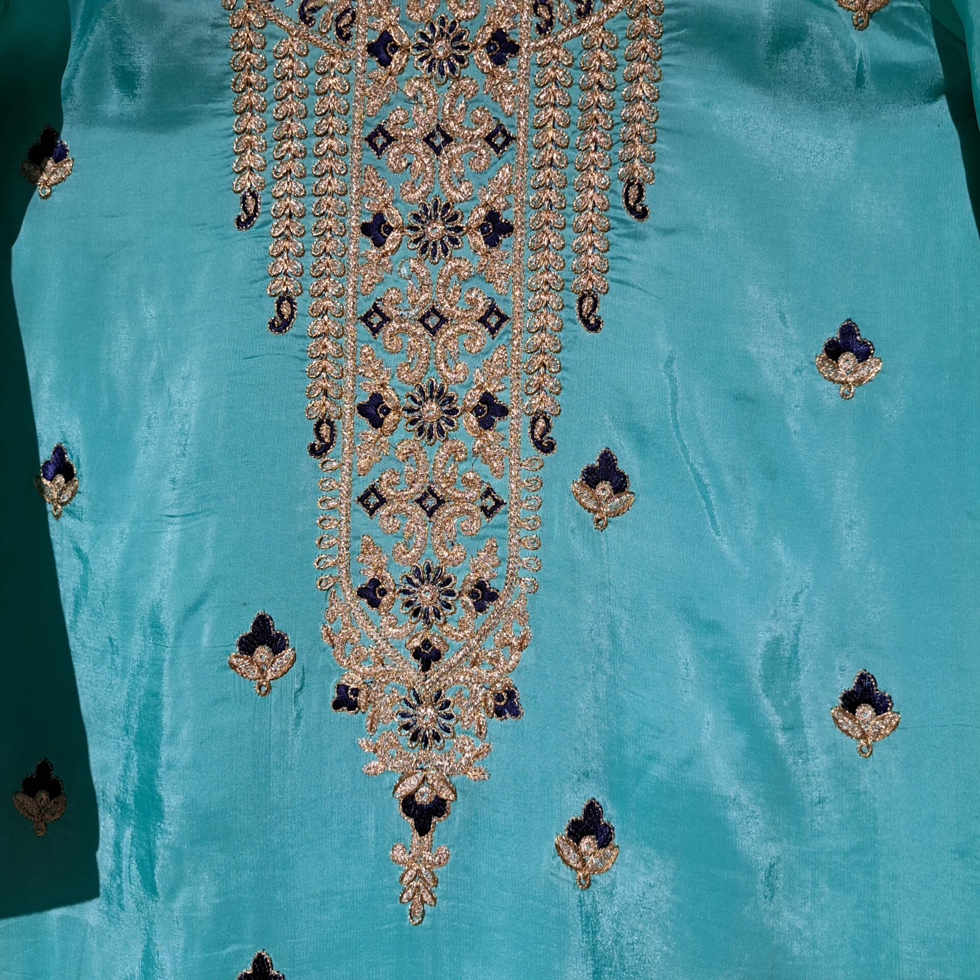 - Fabric: Silk Color Firozi & Navy Blue Dupatta Fabric: Net Four Side Embroidered Border