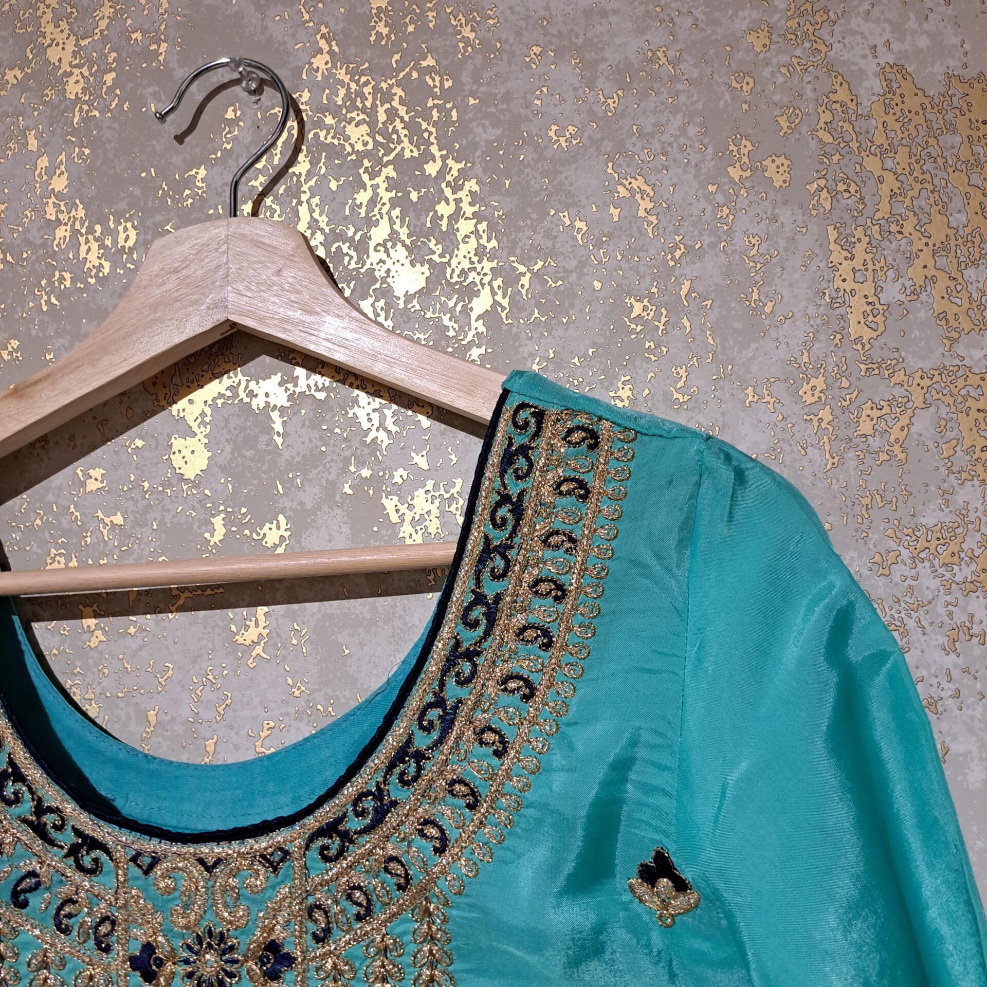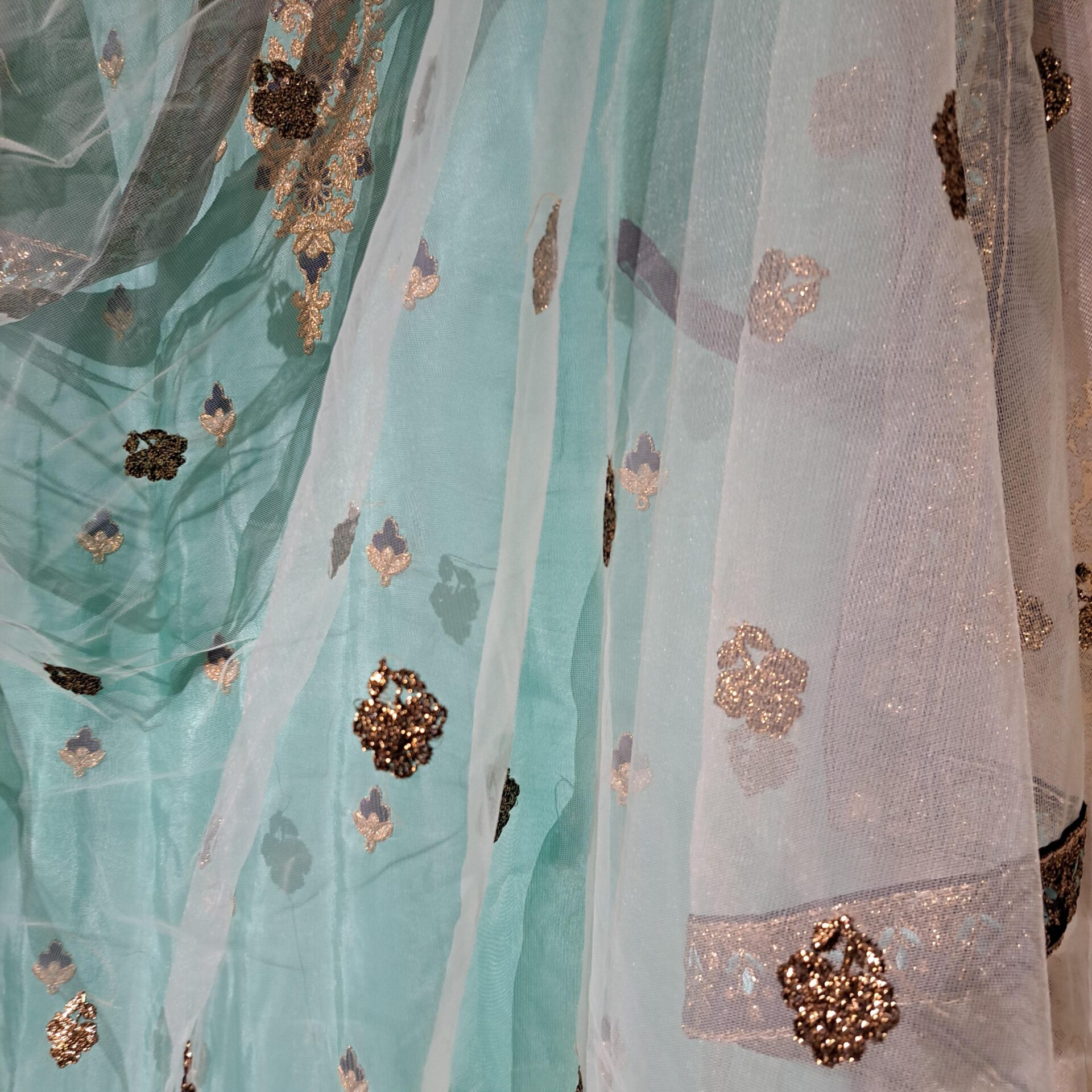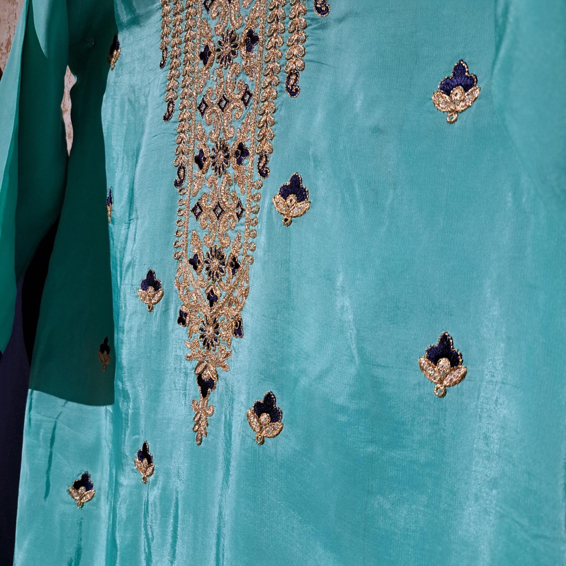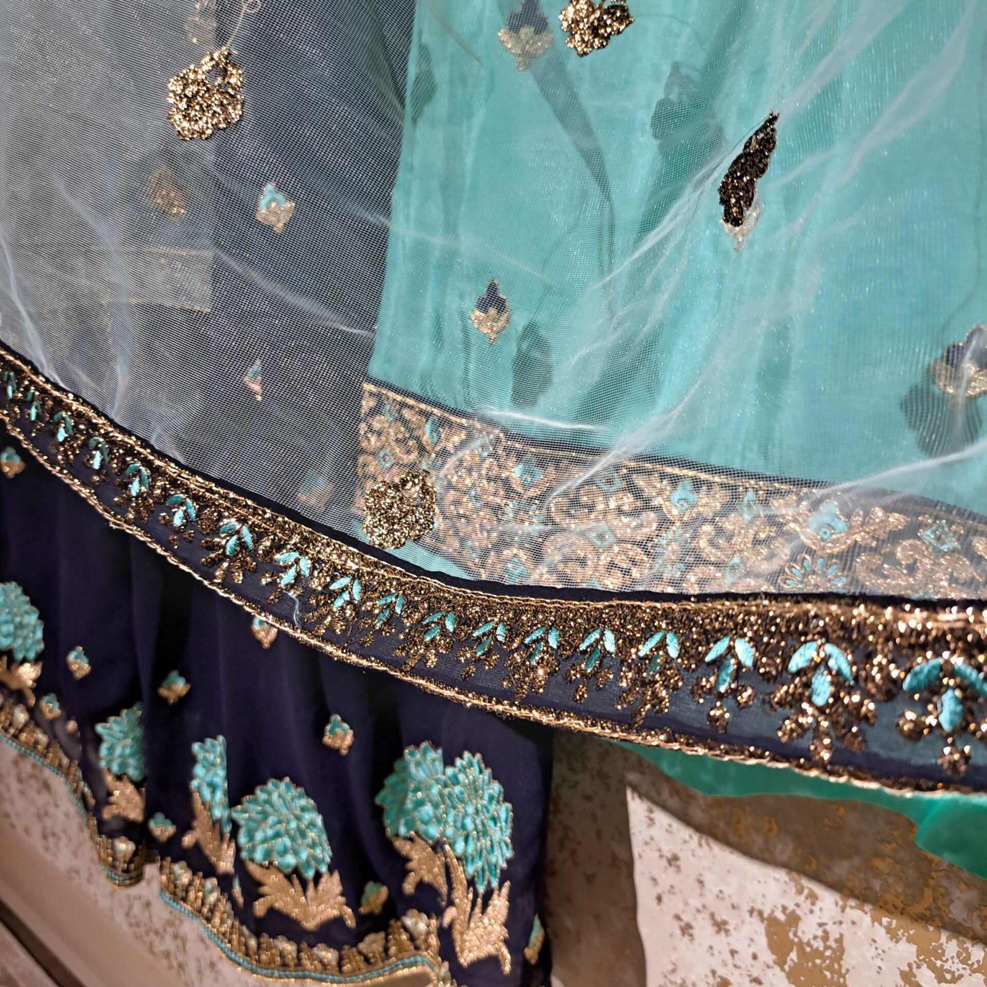 - Fabric: Silk Color Firozi & Navy Blue Dupatta Fabric: Net Four Side Embroidered Border