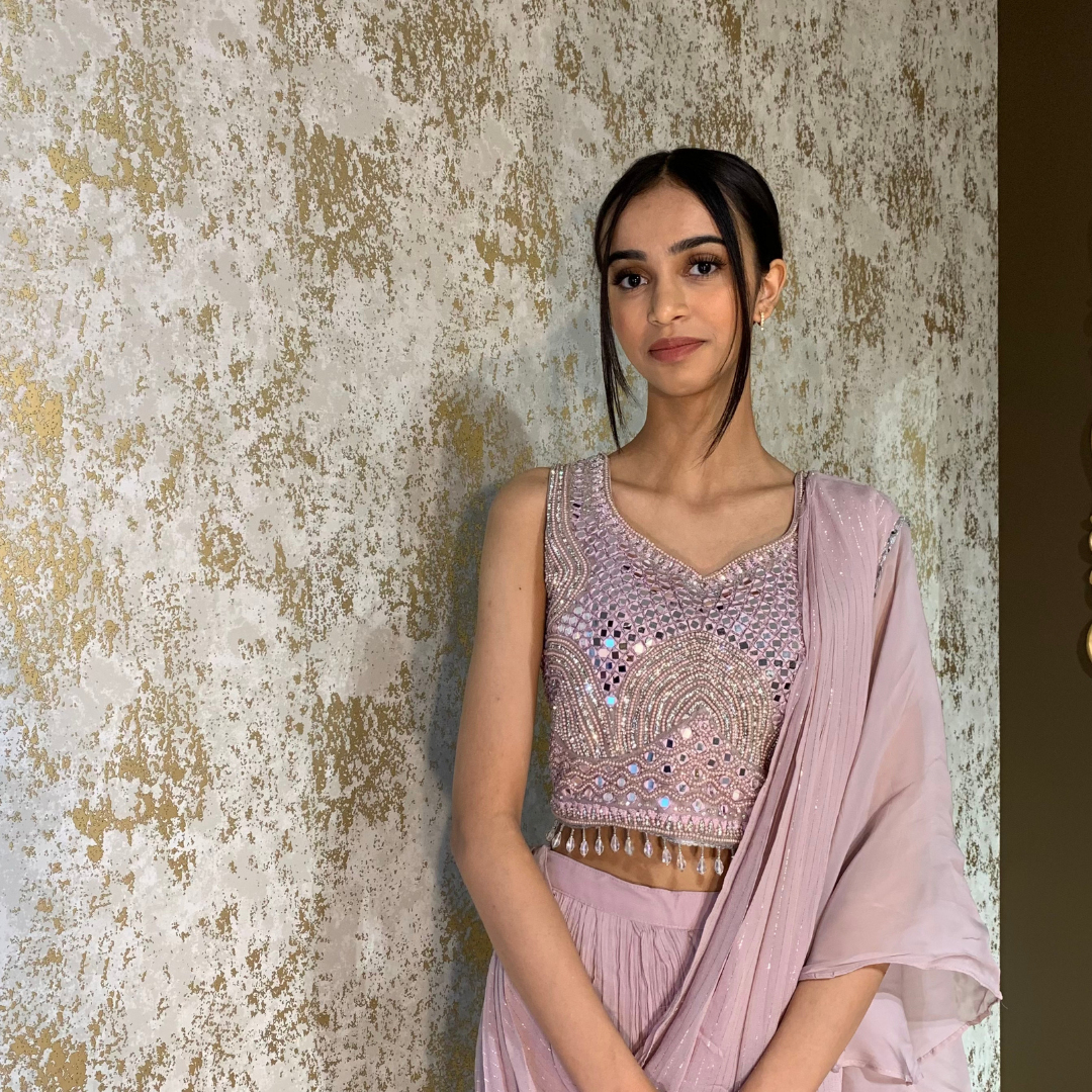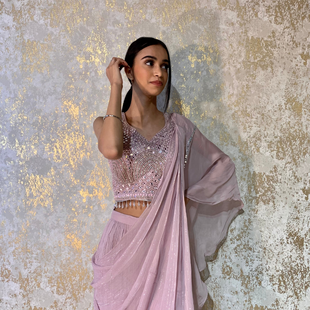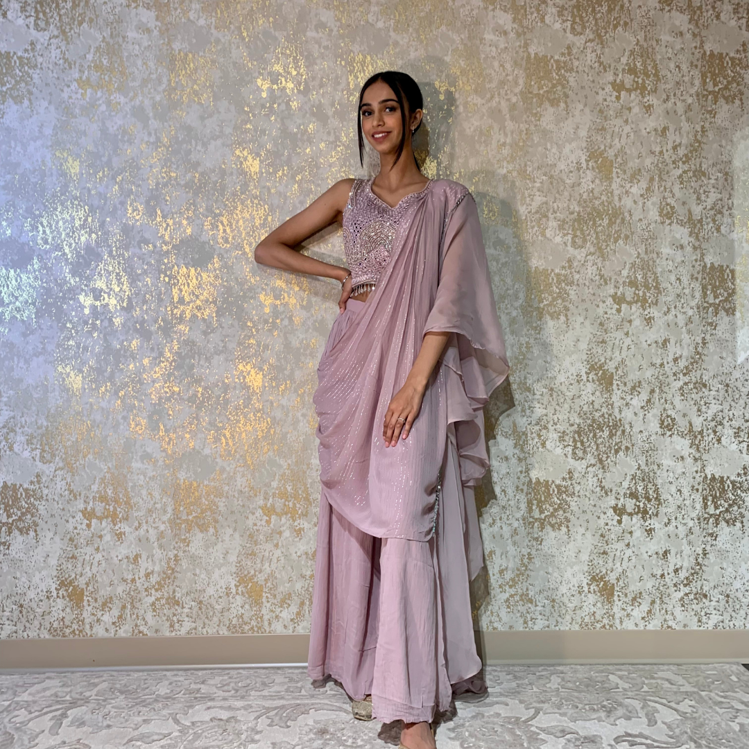 Indo-western Fusion Pant-style Outfit with Pre-stitched Drape – Dusty Pink (heavy mirror handwork on blouse)