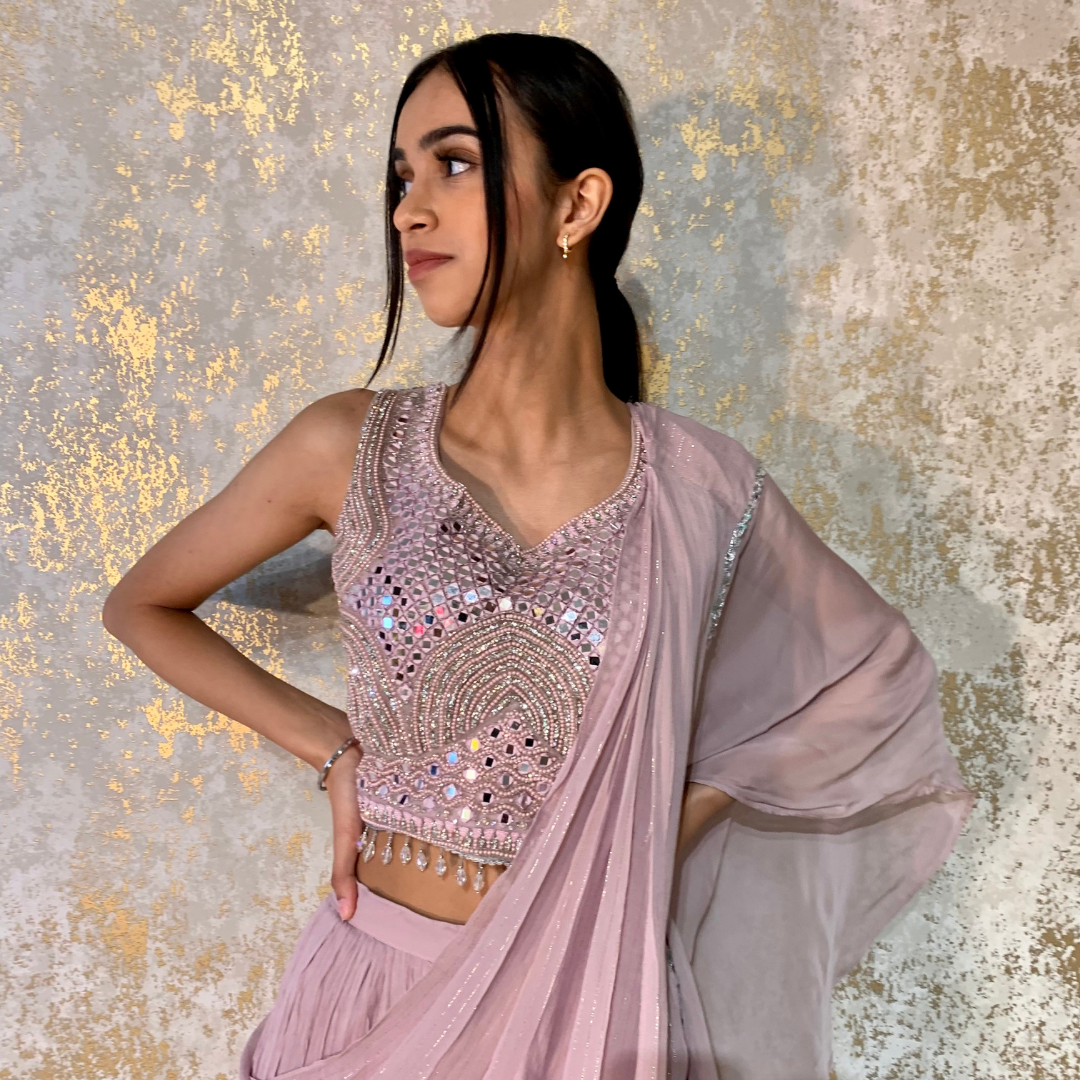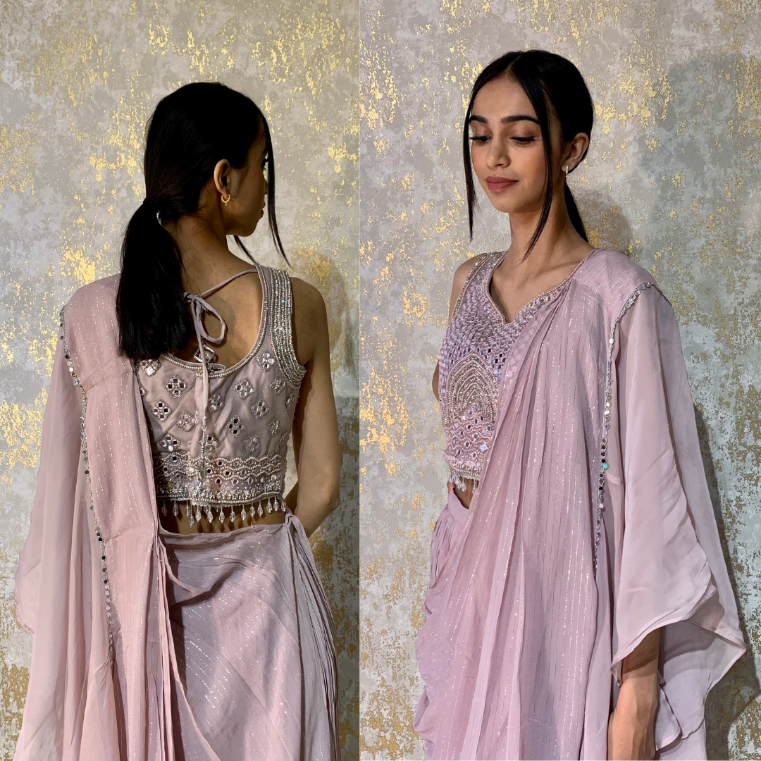 Cape Indo-western Fusion Dhoti-style Outfit – Lavender mirror handwork on blouse