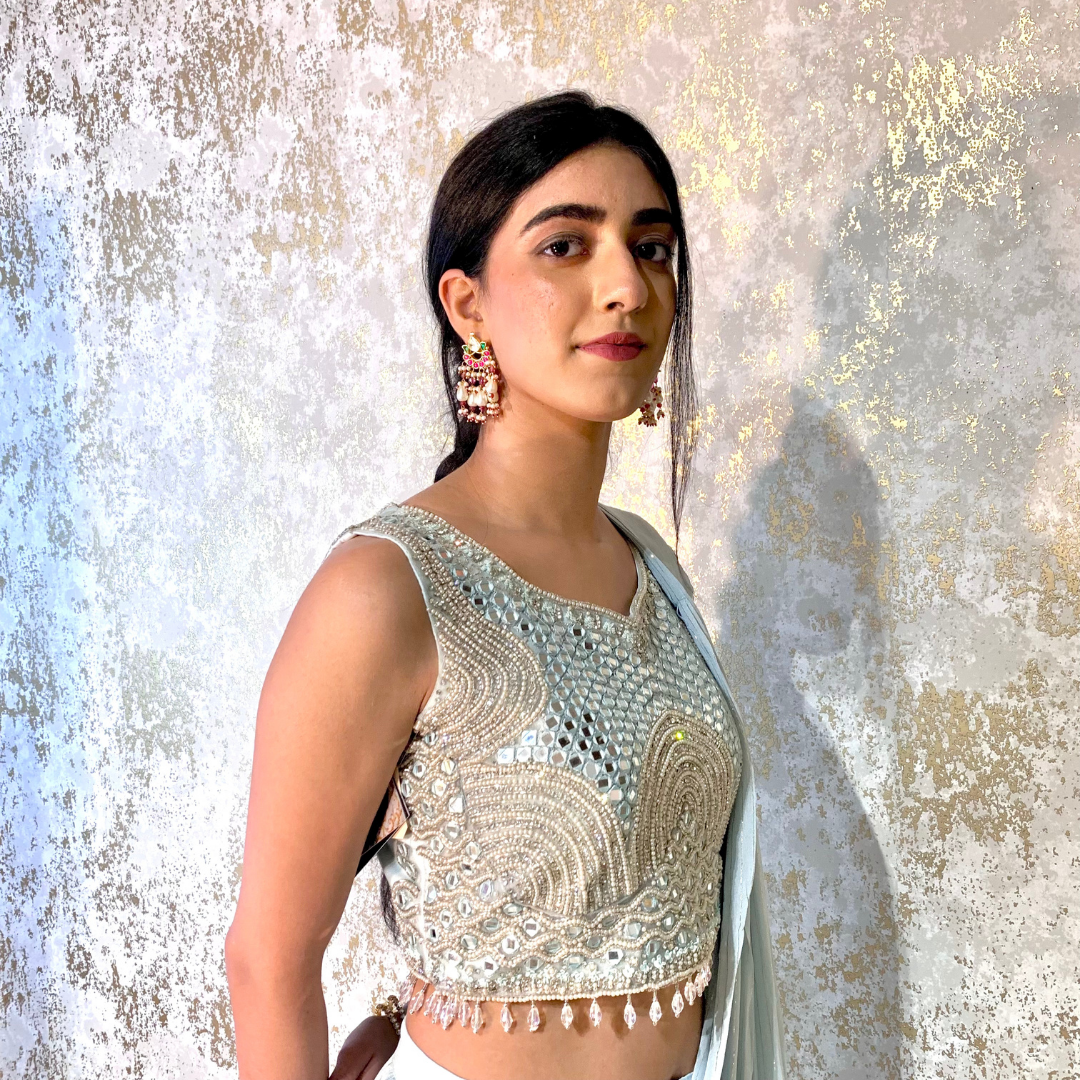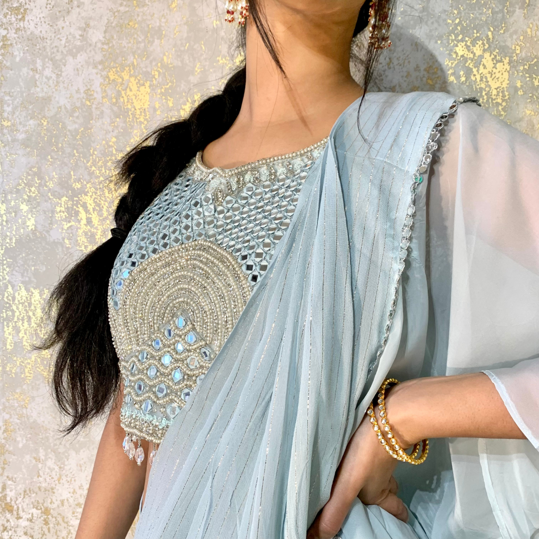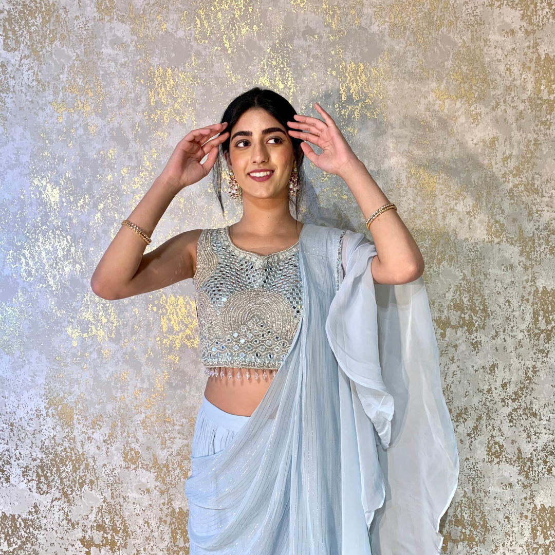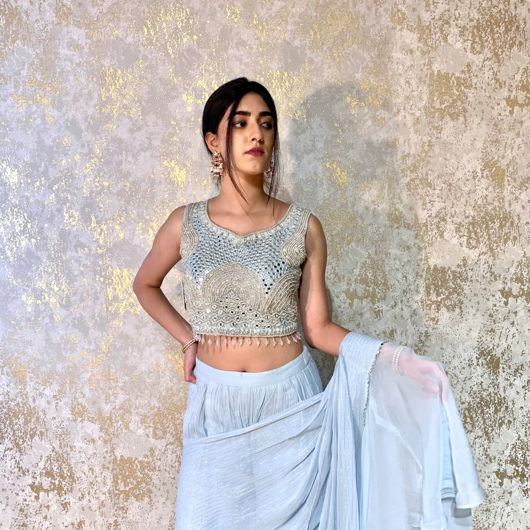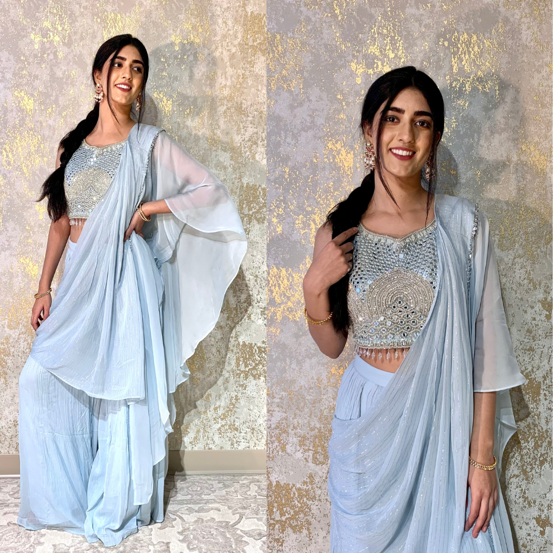 Indo-western Fusion Pant-style Outfit with Pre-stitched Drape – Sky Blue (heavy mirror handwork on blouse)