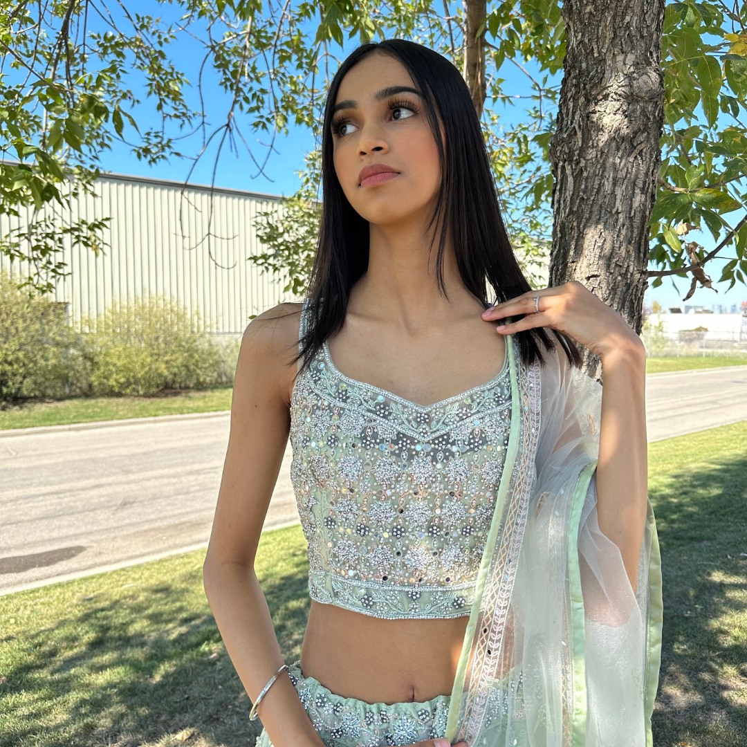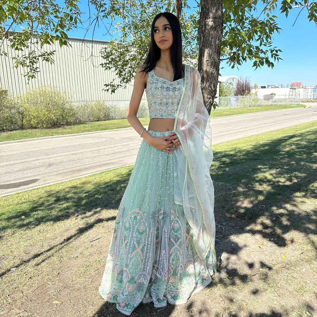 Mint Green Lehenga with Pearl & Mirror Handwork with Thread Motifs