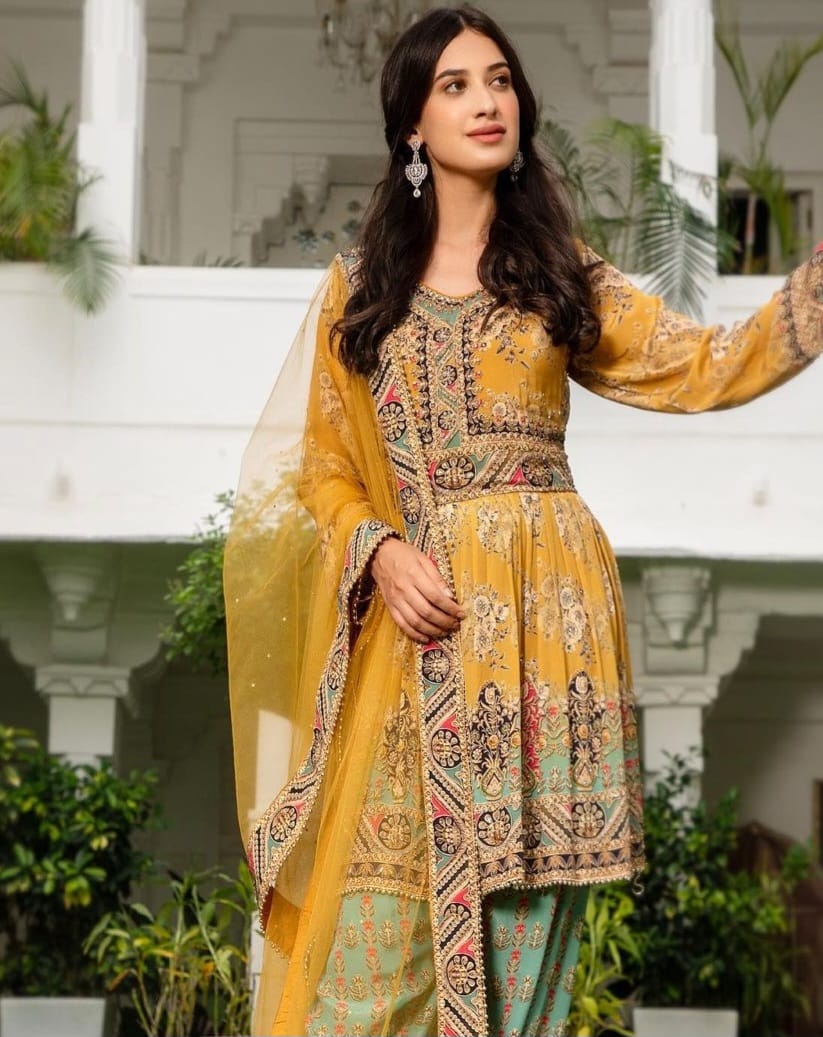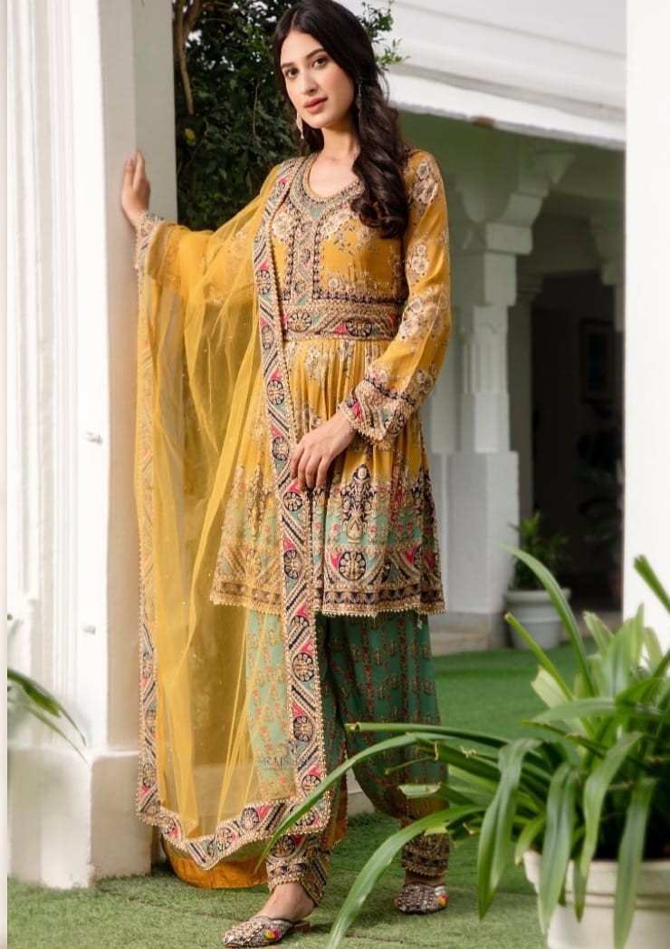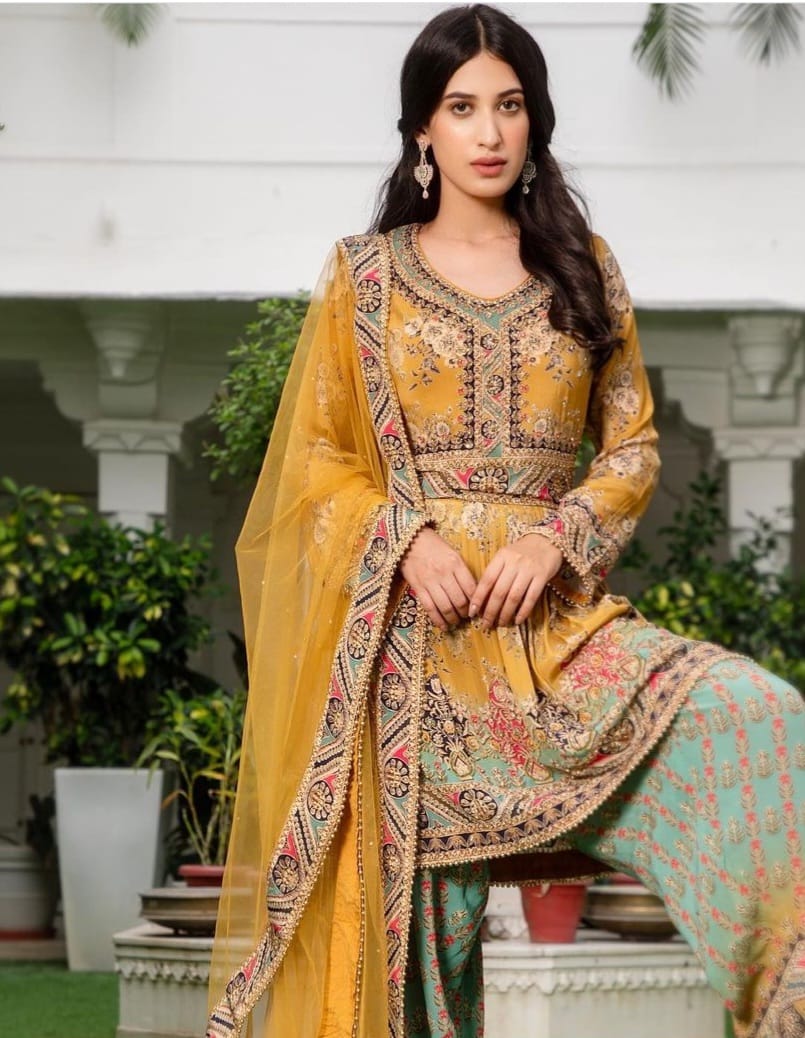 Fully stitched shirt and lower with linings and finishing on dupatta. Can be altered in sizes XS-XL. Punjabi or Pakistani desi suit for women online.