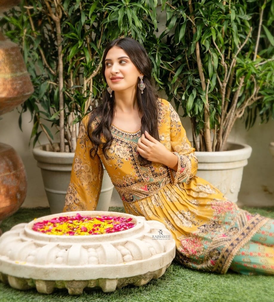 Mustard Green Trouser Suit with Digital Printed Crape Highlighted
