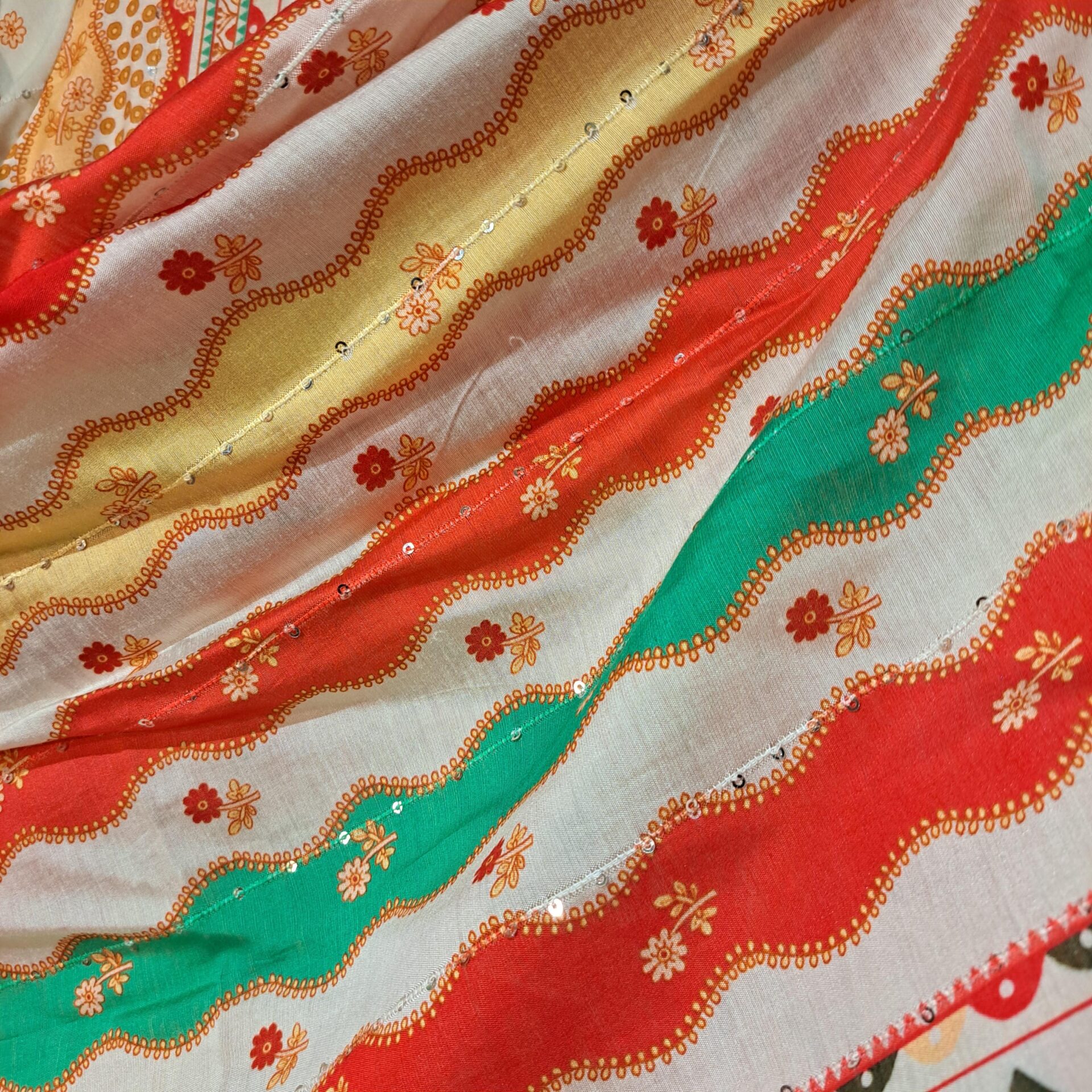 Bright Orange Raw Silk Wide-Leg Pants with Green Silk Blouse with Motifs