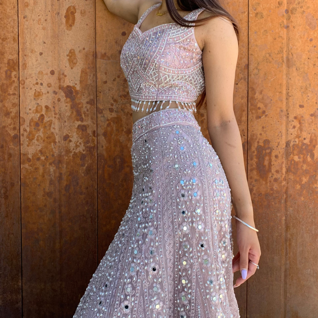 Pearl & Mirror work heavy handwork formal lehenga set in kali-design with intricate work and tassel finishes