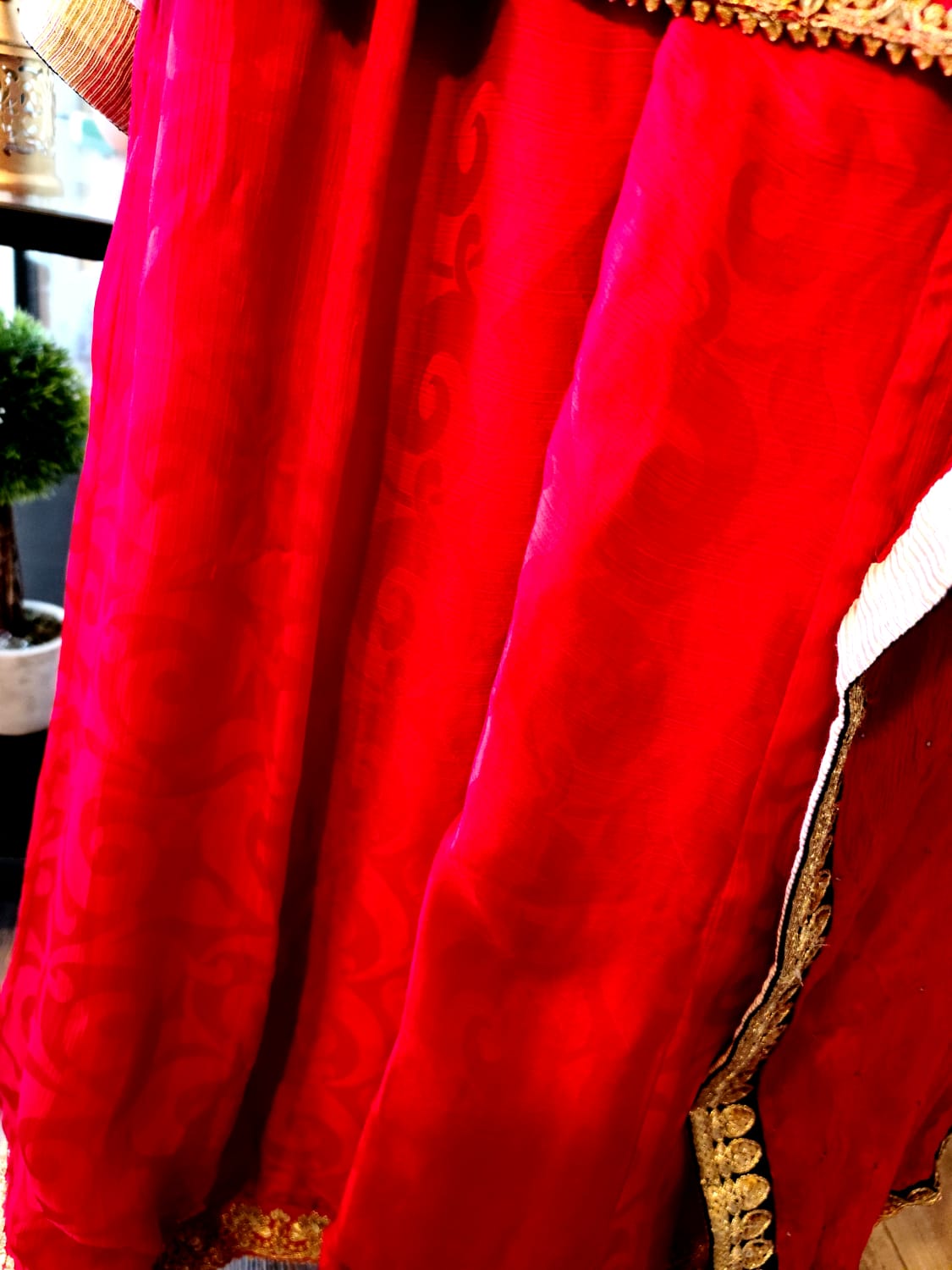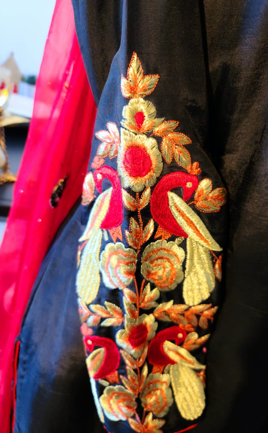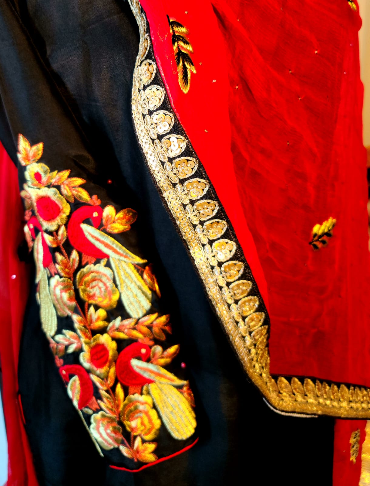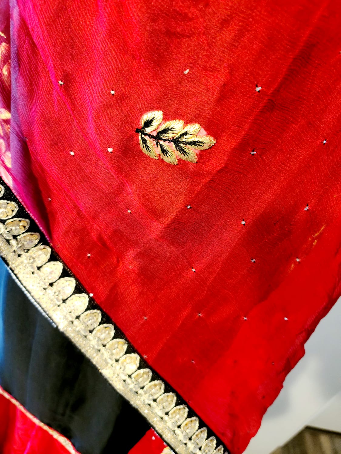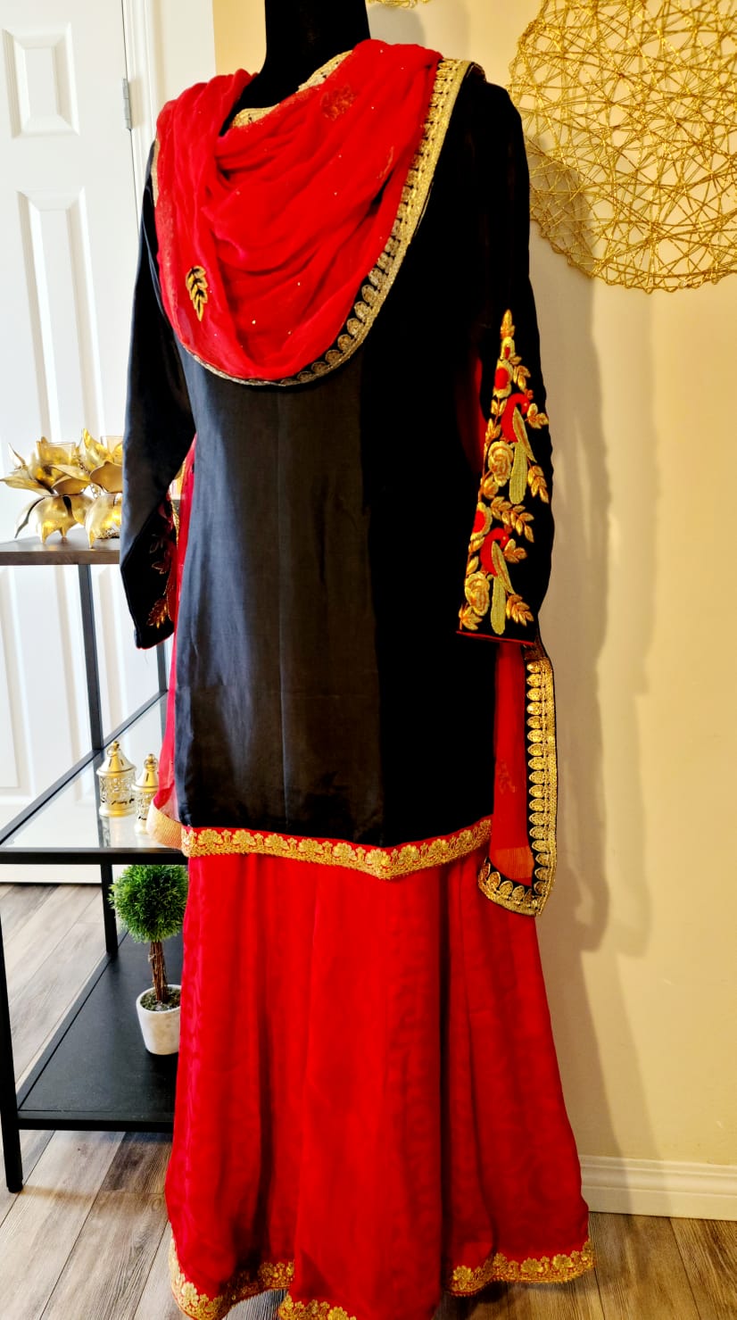 - Shirt Fabric:Silk Shirt Colour: Black Shrara Fabric: Self Chinon Chiffon Shrara Color:Red Dupatta Fabric :Chinon Chiffon Color : Red Four Side Embroidered Border