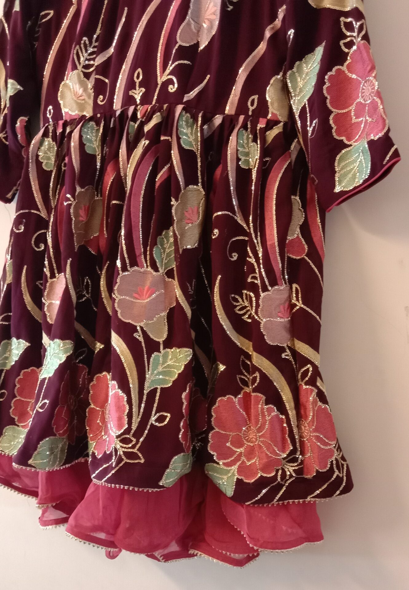 - Dry Clean Only Color: Wine & Peach Frock Suit Sequence Embroidery Shirt Dupatta Four Side Lace Palazzo All Around Lace