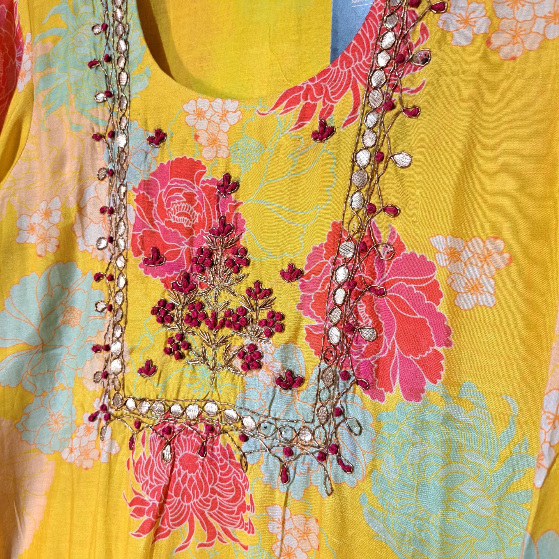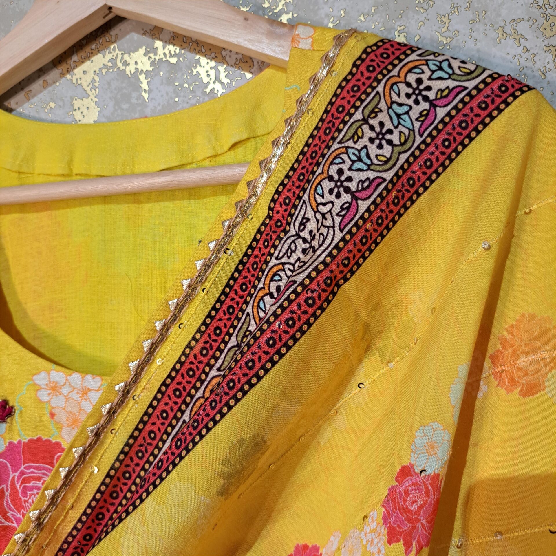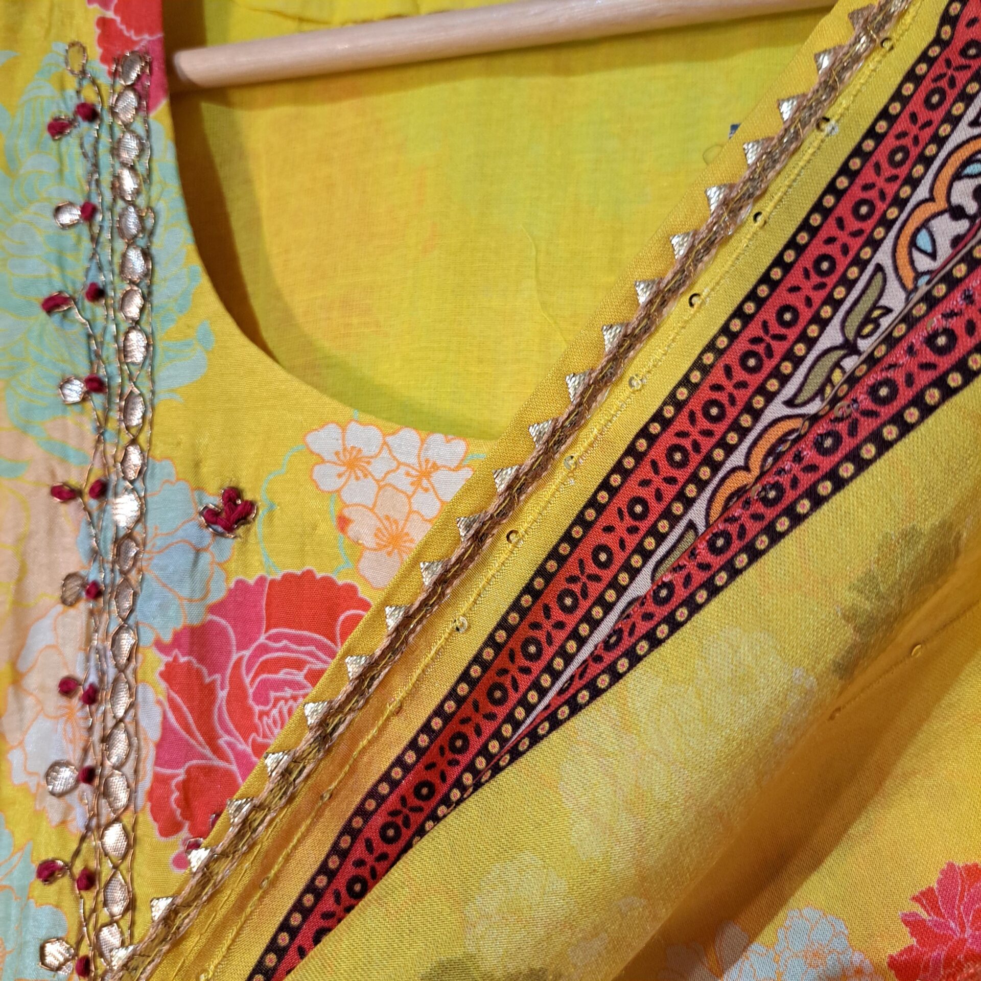 Fabric: Cotton Color Yellow Dupatta Fabric: Cotton Four Side Gota Lace Shirt Dupatta Digital Printed Completely Stitched with Cotton Inner This Would Be Classy yet Fashionable Choice for Festive Season or Regular Wear. Fully Stitched. Customer can Altered this from Small to XL Size because it has margins Inside. Customized Orders Welcome. Dry Clean Only / Fully Stitched Trouser Suit With Dupatta